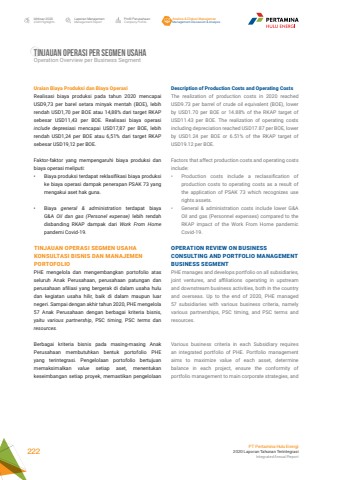 Laporan ManajemenManagement ReportProfil PerusahaanCompany ProfileAnalisa & Diskusi ManajemenManagement Discussion & AnalysisIkhtisar 20202020 HighlightsPT Pertamina Hulu Energi2020 Laporan Tahunan TerintegrasiIntegrated Annual Report 222TINJAUAN OPERASI PER SEGMEN USAHA Operation Overview per Business SegmentDescription of Production Costs and Operating CostsThe realization of production costs in 2020 reached USD9.73 per barrel of crude oil equivalent (BOE), lower by USD1.70 per BOE or 14.88% of the RKAP target of USD11.43 per BOE. The realization of operating costs including depreciation reached USD17.87 per BOE, lower by USD1.24 per BOE or 6.51% of the RKAP target of USD19.12 per BOE.Factors that affect production costs and operating costs include:%u2022 Production costs include a reclassification of production costs to operating costs as a result of the application of PSAK 73 which recognizes use rights assets.%u2022 General & administration costs include lower G&A Oil and gas (Personnel expenses) compared to the RKAP impact of the Work From Home pandemic Covid-19.OPERATION REVIEW ON BUSINESS CONSULTING AND PORTFOLIO MANAGEMENT BUSINESS SEGMENT PHE manages and develops portfolio on all subsidiaries, joint ventures, and affiliations operating in upstream and downstream business activities, both in the country and overseas. Up to the end of 2020, PHE managed 57 subsidiaries with various business criteria, namely various partnerships, PSC timing, and PSC terms and resources. Various business criteria in each Subsidiary requires an integrated portfolio of PHE. Portfolio management aims to maximize value of each asset, determine balance in each project, ensure the conformity of portfolio management to main corporate strategies, and Uraian Biaya Produksi dan Biaya Operasi Realisasi biaya produksi pada tahun 2020 mencapai USD9,73 per barel setara minyak mentah (BOE), lebih rendah USD1,70 per BOE atau 14,88% dari target RKAP sebesar USD11,43 per BOE. Realisasi biaya operasi include depresiasi mencapai USD17,87 per BOE, lebih rendah USD1,24 per BOE atau 6,51% dari target RKAP sebesar USD19,12 per BOE.Faktor-faktor yang mempengaruhi biaya produksi dan biaya operasi meliputi:%u2022 Biaya produksi terdapat reklasifikasi biaya produksi ke biaya operasi dampak penerapan PSAK 73 yang mengakui aset hak guna.%u2022 Biaya general & administration terdapat biaya G&A Oil dan gas (Personel expense) lebih rendah disbanding RKAP dampak dari Work From Home pandemi Covid-19.TINJAUAN OPERASI SEGMEN USAHA KONSULTASI BISNIS DAN MANAJEMEN PORTOFOLIOPHE mengelola dan mengembangkan portofolio atas seluruh Anak Perusahaan, perusahaan patungan dan perusahaan afiliasi yang bergerak di dalam usaha hulu dan kegiatan usaha hilir, baik di dalam maupun luar negeri. Sampai dengan akhir tahun 2020, PHE mengelola 57 Anak Perusahaan dengan berbagai kriteria bisnis, yaitu various partnership, PSC timing, PSC terms dan resources.Berbagai kriteria bisnis pada masing-masing Anak Perusahaan membutuhkan bentuk portofolio PHE yang terintegrasi. Pengelolaan portofolio bertujuan memaksimalkan value setiap aset, menentukan keseimbangan setiap proyek, memastikan pengelolaan