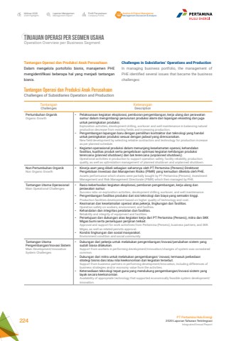Laporan ManajemenManagement ReportProfil PerusahaanCompany ProfileAnalisa & Diskusi ManajemenManagement Discussion & AnalysisIkhtisar 20202020 HighlightsPT Pertamina Hulu Energi2020 Laporan Tahunan TerintegrasiIntegrated Annual Report 224Challenges in Subsidiaries%u2019 Operations and ProductionIn managing business portfolio, the management of PHE identified several issues that became the business challenges:Tantangan Operasi dan Produksi Anak Perusahaan Dalam mengelola portofolio bisnis, manajemen PHE mengidentifikasi beberapa hal yang menjadi tantangan bisnis.Tantangan Operasi dan Produksi Anak PerusahaanChallenges of Subsidiaries Operation and ProductionTantanganChallengesKeteranganDescriptionPertumbuhan OrganikOrganic Growth%u2022 Pelaksanaan kegiatan eksplorasi, pemboran pengembangan, kerja ulang dan perawatan sumur dalam mengimbangi penurunan produksi alami dari lapangan eksisting dan juga untuk peningkatan produksi.Exploration activities, development drilling, workover and well maintenance in balancing natural production decrease from existing fields and increasing production. %u2022 Pengembangan lapangan baru dengan pemilihan kontraktor dan teknologi yang handal untuk peningkatan produksi sesuai dengan jadwal yang direncanakan. New field development by selecting reliable contractors and technology for production increase as per planned schedule. %u2022 Kegiatan operasional produksi dalam menunjang keselamatan operasi, kehandalan fasilitas, kualitas produk serta pengelolaan optimasi kegiatan kehilangan produksi terencana (planned shutdown) dan tak terencana (unplanned shutdown).Operational activities in production to support operation safety, facility reliability, production quality, as well as optimization management of planned shutdown and unplanned shutdown.Non Pertumbuhan Organik Non Organic Growth%u2022 Kinerja aset yang dibeli sebagian sahamnya oleh PT Pertamina (Persero) Direktorat Pengelolaan Investasi dan Manajemen Risiko (PIMR) yang kemudian dikelola oleh PHE.Assets performance which shares were partially bought by PT Pertamina (Persero), Investment Management and Risk Management Directorate (PIMR) which then managed by PHE.Tantangan Utama OperasionalMain Operational Challenges%u2022 Rasio keberhasilan kegiatan eksplorasi, pemboran pengembangan, kerja ulang dan perawatan sumur. Success ratio on exploration activities, development drilling, workover, and well maintenance. %u2022 Pengembangan fasilitas produksi dari sisi teknologi dan biaya yang semakin tinggi.Production facilities development based on higher quality of technology and cost.%u2022 Keamanan dan keselamatan operasi atas pekerja, lingkungan dan fasilitas. Operation safety on workers, environment, and facilties. %u2022 Kehandalan dan integritas peralatan dan fasilitas. Reliability and integrity of equipment and facilities. %u2022 Persetujuan dan dukungan atas kegiatan kerja dari PT Pertamina (Persero), mitra dan SKK Migas bumi serta persetujuan perijinan terkait. Approval and support for work activitives from Pertamina (Persero), business partners, and SKK Migas, as well as related permits approval. %u2022 Kondisi lingkungan dan sosial masyarakat.Environment condition and social community.Tantangan Utama Pengembangan/Inovasi SistemMain Development/innovation System Challenges%u2022 Dukungan dari pekerja untuk melakukan pengembangan/inovasi/perubahan sistem yang sudah biasa dilakukan. Support from workers in performing development/innovation/changes of system was considered common. %u2022 Dukungan dari mitra untuk melakukan pengembangan/ inovasi, termasuk perbedaan strategi bisnis dan/atau nilai keekonomian dari kegiatan tersebut. Support from business partners in performing development/innovation, including differences of business strategies and/or economy value from the activities. %u2022 Ketersediaan teknologi tepat guna yang mendukung pengembangan/inovasi sistem yang layak secara keekonomian.Availability of appropriate technology that supported economically feasible system development/innovation.TINJAUAN OPERASI PER SEGMEN USAHA Operation Overview per Business Segment