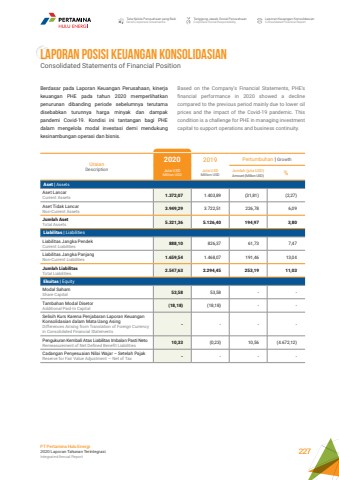 LAPORAN POSISI KEUANGAN KONSOLIDASIANConsolidated Statements of Financial PositionTata Kelola Perusahaan yang BaikGood Corporate GovernanceTanggung Jawab Sosial PerusahaanCorporate Social ResponsibilityLaporan Keuangan KonsolidasianConsolidated Financial ReportPT Pertamina Hulu Energi2020 Laporan Tahunan TerintegrasiIntegrated Annual Report 227Based on the Company%u2019s Financial Statements, PHE%u2019s financial performance in 2020 showed a decline compared to the previous period mainly due to lower oil prices and the impact of the Covid-19 pandemic. This condition is a challenge for PHE in managing investment capital to support operations and business continuity.Berdasar pada Laporan Keuangan Perusahaan, kinerja keuangan PHE pada tahun 2020 memperlihatkan penurunan dibanding periode sebelumnya terutama disebabkan turunnya harga minyak dan dampak pandemi Covid-19. Kondisi ini tantangan bagi PHE dalam mengelola modal investasi demi mendukung kesinambungan operasi dan bisnis.UraianDescription2020 2019 Pertumbuhan | GrowthJuta USDMillion USDJuta USDMillion USDJumlah (juta USD)Amount (Million USD) %Aset | AssetsAset LancarCurrent Assets 1.372,07 1.403,89 (31,81) (2,27)Aset Tidak LancarNon-Current Assets 3.949,29 3.722,51 226,78 6,09Jumlah AsetTotal Assets 5.321,36 5.126,40 194,97 3,80Liabilitas | LiabilitiesLiabilitas Jangka PendekCurrent Liabilities 888,10 826,37 61,73 7,47Liabilitas Jangka PanjangNon-Current Liabilities 1.659,54 1.468,07 191,46 13,04Jumlah LiabilitasTotal Liabilities 2.547,63 2.294,45 253,19 11,03Ekuitas | EquityModal SahamShare Capital 53,58 53,58 - -Tambahan Modal DisetorAdditional Paid-In Capital (18,18) (18,18) - -Selisih Kurs Karena Penjabaran Laporan Keuangan Konsolidasian dalam Mata Uang AsingDifferences Arising from Translation of Foreign Currency in Consolidated Financial Statements- - - -Pengukuran Kembali Atas Liabilitas Imbalan Pasti NetoRemeasurement of Net Defined Benefit Liabilities 10,33 (0,23) 10,56 (4.672,12)Cadangan Penyesuaian Nilai Wajar %u2013 Setelah PajakReserve for Fair Value Adjustment %u2014 Net of Tax - - - -