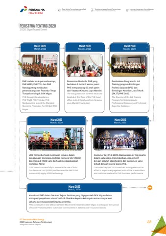 Tata Kelola Perusahaan yang BaikGood Corporate GovernanceTanggung Jawab Sosial PerusahaanCorporate Social ResponsibilityLaporan Keuangan KonsolidasianConsolidated Financial ReportPT Pertamina Hulu Energi2020 Laporan Tahunan TerintegrasiIntegrated Annual Report 23Pembukaan Program On Job Training program Bimbingan Profesi Sarjana (BPS) dan Bimbingan Keahlian Juru Teknik (BKJT) PHE 2020.The Opening of On Job Training Program for Undergraduate Professional Guidance and Technical Expertise Guidance.Peresmian Musholla PHE yang berlokasi di lantai 2 kantor pusat PHE mengundang 60 anak yatim dari Yayasan Kesuma Jaya Mandiri.The inauguration of the PHE Musholla located at 2nd floor of the PHE head office invite 60 orphans from Kesuma Jaya Mandiri Foundation.PHE melalui anak perusahaannya, PHE WMO, PHE TEJ dan PHE Randugunting melakukan penandatanganan Prosedur Tetap Tumpahan Minyak SKK Migas. PHE through its subsidiaries, PHE WMO, PHE TEJ dan PHE Randugunting signed the Standard Operating Procedure For Oil Spill SKK Migas.Maret 2020March, 2020Maret 2020March , 2020Maret 2020March, 2020Peristiwa Penting 20202020 Significant EventKontribusi PHE dalam Gerakan Sejuta Sanitizer yang digagas oleh SKK Migas dalam antisipasi penyebaran virus Covid-19 diberikan kepada kelompok rentan masyarakat Jakarta dan masyarakat Kepulauan Seribu.PHE contribute in One Million Sanitizer Movement initiated by SKK Migas to anticipate the spread of Covid-19 distributed to vulnerable communities in Jakarta and Thousand Islands.Maret 2020March, 2020JOB Tomori berhasil melakukan inovasi dalam penggunaan teknologi Acid Gas Removal Unit (AGRU) dan menjadi KKKS yang berhasil mengaplikasikan teknologi AGRU.JOB Tomori successfully to innovate the use of Acid Gas Removal Unit (AGRU) and became the KKKS that successfully apply AGRU technology.Customer Day PHE 2020 dilaksanakan di Yogyakarta dalam satu upaya meningkatkan engagement dengan seluruh stakeholders dan customers yang terkait dengan kinerja bisnis PHE.Customer Day PHE 2020 was held in Yogyakarta in an effort to improve engagement with all the stakeholders and customers related to PHE business performance. Maret 2020March, 2020Maret 2020March, 2020