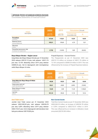 Tata Kelola Perusahaan yang BaikGood Corporate GovernanceTanggung Jawab Sosial PerusahaanCorporate Social ResponsibilityLaporan Keuangan KonsolidasianConsolidated Financial ReportPT Pertamina Hulu Energi2020 Laporan Tahunan TerintegrasiIntegrated Annual Report 231Prepaid Expenses %u2013 Current PortionThe Prepayments as per 31 December 2020 was USD101.10 million, an increase of USD11.76 million or 13.16% compared to USD89.34 million in 2019. This was influenced by the increase of Prepaid Expenses balance.Non-Current Assets Total Non-Current Assets as per 31 December 2020 was USD3,949.29 million, an increase of USD226.78 million or 6.09% compared to USD3,722.51 million in 2019. This was influenced by an increase in Utilization Asset amounted USD192.88 million.LAPORAN POSISI KEUANGAN KONSOLIDASIANConsolidated Statements of Financial PositionUraianDescription2020 2019 Pertumbuhan | GrowthJuta USDMillion USDJuta USDMillion USDJumlah (juta USD)Amount (Million USD) %PersediaanInventory 127,60 115,01 12,59 10,95Material Umum General Materials 135,31 128,60 6,70 5,21dikurangi:minus:Penyisihan penurunan nilaiProvision for impairment (7,70) (13,59) 5,89 (43,33)Biaya Dibayar Dimuka %u2013 Bagian LancarUang Muka dan Biaya Dibayar Dimuka per 31 Desember 2020 sebesar USD101,10 juta, naik sebesar USD11,76 juta atau 13,16% dibanding tahun 2019 yang sebesar USD89,34 juta. Hal ini dipengaruhi oleh meningkatnya saldo Biaya dibayar di muka.UraianDescription2020 2019 Pertumbuhan | GrowthJuta USDMillion USDJuta USDMillion USDJumlah (juta USD)Amount (Million USD) %Uang Muka dan Biaya Dibayar Di MukaPrepayments 49,38 44,53 4,85 10,90Uang muka cash call Cash Call advances 39,31 43,83 (4,52) (10,32)Biaya dibayar di muka Prepayments 12,40 0,98 11,43 1.169,60Lain-lain Others 101,10 89,34 11,76 13,16Aset Tidak Lancar Jumlah Aset Tidak Lancar per 31 Desember 2020 sebesar USD3.949,29 juta, naik sebesar USD226,78 juta atau 6,09% dibanding tahun 2019 yang sebesar USD3.722,51 juta. Hal ini dipengaruhi oleh kenaikan Aset hak-guna sebesar USD192,88 juta.