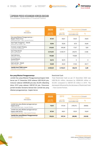 Laporan ManajemenManagement ReportProfil PerusahaanCompany ProfileAnalisa & Diskusi ManajemenManagement Discussion & AnalysisIkhtisar 20202020 HighlightsPT Pertamina Hulu Energi2020 Laporan Tahunan TerintegrasiIntegrated Annual Report 232LAPORAN POSISI KEUANGAN KONSOLIDASIANConsolidated Statements of Financial PositionRestricted CashTotal Restricted Cash as per 31 December 2020 was USD106.36 million, decrease by USD80.88 million or 43.20% compared to USD187.24 million in 2019. The decreased influenced by the decrease of Restricted Cash %u2013 Non Current Portion.UraianDescription2020 2019 Pertumbuhan | GrowthJuta USDMillion USDJuta USDMillion USDJumlah (juta USD)Amount (Million USD) %Kas yang Dibatasi Penggunaannya %u2013 Bagian Tidak Lancar Restricted Cash %u2013 Non- Current Portion87,94 65,61 22,33 34,03Aset Pajak Tangguhan %u2013 Bersih Deferred Tax Assets - Net 33,96 25,26 8,70 34,46Investasi Jangka Panjang Long-Term Investment 310,45 293,38 17,07 5,82Aset Tetap Bersih Net Fixed Assets 3.216,92 3.252,19 (35,27) (1,08)Aset Hak Guna Utilization Assets 192,88 - 192,88 -Goodwill Bersih Net Goodwill 53,75 53,75 0 0Aset Lain-lain %u2013 Bersih Other Assets - Net 53,38 32,32 21,06 65,17Jumlah Aset Tidak LancarTotal Non-current Assets 3.949,29 3.722,51 226,78 6,09Kas yang Dibatasi Penggunaannya Jumlah Kas yang Dibatasi Penggunaannya-bagian tidak lancar per 31 Desember 2020 sebesar USD106,36 juta, menurun sebesar USD80,88 juta atau 43,20% dibanding tahun 2019 yang sebesar USD187,24 juta. Penurunan jumlah tersebut terutama berasal dari Jumlah kas yang dibatasi penggunaannya - bagian lancar.UraianDescription2020 2019 Pertumbuhan | GrowthJuta USDMillion USDJuta USDMillion USDJumlah (juta USD)Amount (Million USD) %Jumlah kas yang dibatasi penggunaannya - bagian lancarTotal Restricted Cash - Current Portion18,42 121,64 (103,21) (84,86)Jumlah kas yang dibatasi penggunaannya - bagian tidak lancarTotal Restricted Cash - Non Current Portion 87,94 65,61 22,33 34,04Jumlah Kas yang Dibatasi PenggunaannyaTotal Restricted Cash 106,36 187,24 (80,88) (43,20)