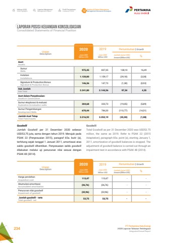 Laporan ManajemenManagement ReportProfil PerusahaanCompany ProfileAnalisa & Diskusi ManajemenManagement Discussion & AnalysisIkhtisar 20202020 HighlightsPT Pertamina Hulu Energi2020 Laporan Tahunan TerintegrasiIntegrated Annual Report 234GoodwillTotal Goodwill as per 31 December 2020 was USD53.75 million, the same as 2019. Refer to PSAK 22 (2015 Adaptation), paragraph 65a. point (a), starting January 1, 2011, amortization of goodwill balances is stopped. The adjustment of goodwill balance is carried out through an impairment test in accordance with PSAK 48 (2014).LAPORAN POSISI KEUANGAN KONSOLIDASIANConsolidated Statements of Financial PositionUraianDescription2020 2019 Pertumbuhan | GrowthJuta USDMillion USDJuta USDMillion USDJumlah (juta USD)Amount (Million USD) %Aset:Assets:SumurWells 975,45 837,35 138,10 16,49Instalasi Installations 1.120,00 1.159,17 (39,18) (3,38)Signature & Production Bonus Signature & Production Bonus 146,36 147,73 (1,38) (0,93)Sub JumlahSub Total 2.241,80 2.144,26 97,54 4,55Aset dalam Penyelesaian: Assets in Construction:Sumur eksplorasi & evaluasiExploration & evaluation wells 304,68 323,73 (19,05) (5,89)Sumur PengembanganDevelopment Wells 670,44 784,20 (113,77) (14,51)Jumlah Aset TetapTotal Fixed Assets 3.216,92 3.252,19 (35,28) (1,08)Goodwill Jumlah Goodwill per 31 Desember 2020 sebesar USD53,75 juta, sama dengan tahun 2019. Merujuk pada PSAK 22 (Penyesuaian 2015), paragraf 65a. butir (a), terhitung sejak tanggal 1 Januari 2011, amortisasi atas saldo goodwill dihentikan. Penyesuaian saldo goodwill dilakukan melalui uji penurunan nilai sesuai dengan PSAK 48 (2014).UraianDescription2020 2019 Pertumbuhan | GrowthJuta USDMillion USDJuta USDMillion USDJumlah (juta USD)Amount (Million USD) %Harga perolehan Acquisition cost 113,47 113,47 - -Akumulasi amortisasi Accumulated amortization (26,76) (26,76) - -Penurunan nilai goodwill Impairment of goodwill (32,96) (32,96) - - Jumlah goodwill - neto Total goodwill - net 53,75 53,75 - -