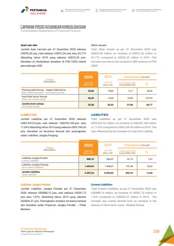Tata Kelola Perusahaan yang BaikGood Corporate GovernanceTanggung Jawab Sosial PerusahaanCorporate Social ResponsibilityLaporan Keuangan KonsolidasianConsolidated Financial ReportPT Pertamina Hulu Energi2020 Laporan Tahunan TerintegrasiIntegrated Annual Report 235LAPORAN POSISI KEUANGAN KONSOLIDASIANConsolidated Statements of Financial PositionOther Assets Total Other Assets as per 31 December 2020 was USD53.38 million, an increase of USD21.06 million or 65.17% compared to USD32.32 million in 2019. This increase was due to the increase in ASR reserves at PHE OSES.LIABILITIES Total Liabilities as per 31 December 2020 was USD2,547.63 million, an increase of USD253.184 million or 11.03% compared to USD2,294.45 million in 2019. This was influenced by the increase of Long Term Liability.Current Liabilities Total Current Liabilities as per 31 December 2020 was USD888.10 million, an increase of USD61.73 million or 7.47% compared to USD826.37 million in 2019. The increase was mainly derived from an increase in the balance of Short-term Loans - Related Parties.Aset Lain-lain Jumlah Aset Lain-lain per 31 Desember 2020 sebesar USD53,38 juta, naik sebesar USD21,06 juta atau 65,17% dibanding tahun 2019 yang sebesar USD32,32 juta. Kenaikan ini disebabkan kenaikan di PHE OSES terkait pencadangan ASR.UraianDescription2020 2019 Pertumbuhan | GrowthJuta USDMillion USDJuta USDMillion USDJumlah (juta USD)Amount (Million USD) %Piutang pajak lainnya - bagian tidak lancarOther taxes receivable %u2013 non-current portion 25,00 19,83 5,17 26,06Aset tidak lancar lainnya Other non-current assets 28,39 12,49 15,90 127,25Jumlah Aset LainnyaTotal Other Assets 53,38 32,32 21,06 65,17LIABILITAS Jumlah Liabilitas per 31 Desember 2020 sebesar USD2.547,63 juta, naik sebesar USD253,184 juta atau 11,03% dibanding tahun 2019 yang sebesar USD2.294,45 juta. Kenaikan ini terutama berasal dari peningkatan saldo Liabilitas Jangka Panjang.UraianDescription2020 2019 Pertumbuhan | GrowthJuta USDMillion USDJuta USDMillion USDJumlah (juta USD)Amount (Million USD) %Liabilitas Jangka PendekCurrent Liabilities 888,10 826,37 61,73 7,47Liabilitas Jangka PanjangNon-Current Liabilities 1.659,54 1.468,07 191,46 13,04Jumlah LiabilitasTotal Liabilities 2.547,63 2.294,45 253,19 11,03Liabilitas Jangka PendekJumlah Liabilitas Jangka Pendek per 31 Desember 2020 sebesar USD888,10 juta, naik sebesar USD61,73 juta atau 7,47%, dibanding tahun 2019 yang sebesar USD826,37 juta. Peningkatan tersebut terutama berasal dari kenaikan saldo Pinjaman Jangka Pendek %u2013 Pihak Berelasi.