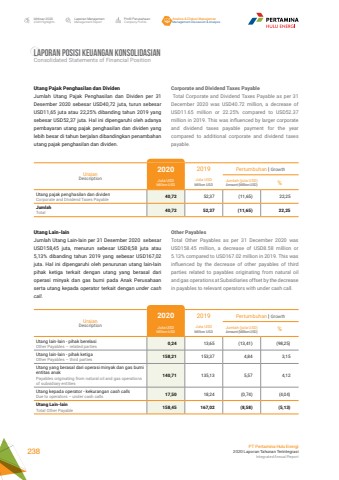 Laporan ManajemenManagement ReportProfil PerusahaanCompany ProfileAnalisa & Diskusi ManajemenManagement Discussion & AnalysisIkhtisar 20202020 HighlightsPT Pertamina Hulu Energi2020 Laporan Tahunan TerintegrasiIntegrated Annual Report 238Corporate and Dividend Taxes Payable Total Corporate and Dividend Taxes Payable as per 31 December 2020 was USD40.72 million, a decrease of USD11.65 million or 22.25% compared to USD52.37 million in 2019. This was influenced by larger corporate and dividend taxes payable payment for the year compared to additional corporate and dividend taxes payable.Other Payables Total Other Payables as per 31 December 2020 was USD158.45 million, a decrease of USD8.58 million or 5.13% compared to USD167.02 million in 2019. This was influenced by the decrease of other payables of third parties related to payables originating from natural oil and gas operations at Subsidiaries offset by the decrease in payables to relevant operators with under cash call.LAPORAN POSISI KEUANGAN KONSOLIDASIANConsolidated Statements of Financial PositionUtang Pajak Penghasilan dan Dividen Jumlah Utang Pajak Penghasilan dan Dividen per 31 Desember 2020 sebesar USD40,72 juta, turun sebesar USD11,65 juta atau 22,25% dibanding tahun 2019 yang sebesar USD52,37 juta. Hal ini dipengaruhi oleh adanya pembayaran utang pajak penghasilan dan dividen yang lebih besar di tahun berjalan dibandingkan penambahan utang pajak penghasilan dan dividen.UraianDescription2020 2019 Pertumbuhan | GrowthJuta USDMillion USDJuta USDMillion USDJumlah (juta USD)Amount (Million USD) %Utang pajak penghasilan dan dividenCorporate and Dividend Taxes Payable 40,72 52,37 (11,65) 22,25JumlahTotal 40,72 52,37 (11,65) 22,25Utang Lain-lain Jumlah Utang Lain-lain per 31 Desember 2020 sebesar USD158,45 juta, menurun sebesar USD8,58 juta atau 5,13% dibanding tahun 2019 yang sebesar USD167,02 juta. Hal ini dipengaruhi oleh penurunan utang lain-lain pihak ketiga terkait dengan utang yang berasal dari operasi minyak dan gas bumi pada Anak Perusahaan serta utang kepada operator terkait dengan under cash call.UraianDescription2020 2019 Pertumbuhan | GrowthJuta USDMillion USDJuta USDMillion USDJumlah (juta USD)Amount (Million USD) %Utang lain-lain - pihak berelasiOther Payables %u2013 related parties 0,24 13,65 (13,41) (98,25)Utang lain-lain - pihak ketigaOther Payables %u2013 third parties 158,21 153,37 4,84 3,15Utang yang berasal dari operasi minyak dan gas bumi entitas anakPayables originating from natural oil and gas operations of subsidiary entities140,71 135,13 5,57 4,12Utang kepada operator - kekurangan cash callsDue to operators %u2013 under cash calls 17,50 18,24 (0,74) (4,04)Utang Lain-lainTotal Other Payable 158,45 167,02 (8,58) (5,13)