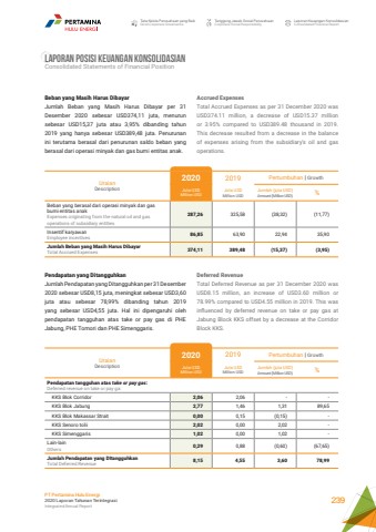 Tata Kelola Perusahaan yang BaikGood Corporate GovernanceTanggung Jawab Sosial PerusahaanCorporate Social ResponsibilityLaporan Keuangan KonsolidasianConsolidated Financial ReportPT Pertamina Hulu Energi2020 Laporan Tahunan TerintegrasiIntegrated Annual Report 239LAPORAN POSISI KEUANGAN KONSOLIDASIANConsolidated Statements of Financial PositionAccrued Expenses Total Accrued Expenses as per 31 December 2020 was USD374.11 million, a decrease of USD15.37 million or 3.95% compared to USD389.48 thousand in 2019. This decrease resulted from a decrease in the balance of expenses arising from the subsidiary%u2019s oil and gas operations.Deferred Revenue Total Deferred Revenue as per 31 December 2020 was USD8.15 million, an increase of USD3.60 million or 78.99% compared to USD4.55 million in 2019. This was influenced by deferred revenue on take or pay gas at Jabung Block KKS offset by a decrease at the Corridor Block KKS.Beban yang Masih Harus Dibayar Jumlah Beban yang Masih Harus Dibayar per 31 Desember 2020 sebesar USD374,11 juta, menurun sebesar USD15,37 juta atau 3,95% dibanding tahun 2019 yang hanya sebesar USD389,48 juta. Penurunan ini terutama berasal dari penurunan saldo beban yang berasal dari operasi minyak dan gas bumi entitas anak.UraianDescription2020 2019 Pertumbuhan | GrowthJuta USDMillion USDJuta USDMillion USDJumlah (juta USD)Amount (Million USD) %Beban yang berasal dari operasi minyak dan gas bumi entitas anakExpenses originating from the natural oil and gas operations of subsidiary entities287,26 325,58 (38,32) (11,77)Insentif karyawanEmployee incentives 86,85 63,90 22,94 35,90Jumlah Beban yang Masih Harus DibayarTotal Accrued Expenses 374,11 389,48 (15,37) (3,95)Pendapatan yang DitangguhkanJumlah Pendapatan yang Ditangguhkan per 31 Desember 2020 sebesar USD8,15 juta, meningkat sebesar USD3,60 juta atau sebesar 78,99% dibanding tahun 2019 yang sebesar USD4,55 juta. Hal ini dipengaruhi oleh pendapatan tangguhan atas take or pay gas di PHE Jabung, PHE Tomori dan PHE Simenggaris.UraianDescription2020 2019 Pertumbuhan | GrowthJuta USDMillion USDJuta USDMillion USDJumlah (juta USD)Amount (Million USD) %Pendapatan tangguhan atas take or pay gas:Deferred revenue on take or pay ga:KKS Blok Corridor 2,06 2,06 - -KKS Blok Jabung 2,77 1,46 1,31 89,65KKS Blok Makassar Strait 0,00 0,15 (0,15) -KKS Senoro tolii 2,02 0,00 2,02 -KKS Simenggaris 1,02 0,00 1,02 -Lain-lainOthers 0,29 0,88 (0,60) (67,65)Jumlah Pendapatan yang DItangguhkanTotal Deferred Revenue 8,15 4,55 3,60 78,99