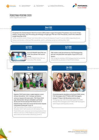 Laporan ManajemenManagement ReportProfil PerusahaanCompany ProfileAnalisa & Diskusi ManajemenManagement Discussion & AnalysisIkhtisar 20202020 HighlightsPT Pertamina Hulu Energi2020 Laporan Tahunan TerintegrasiIntegrated Annual Report 24Peristiwa Penting 20202020 Significant EventPHE melalui anak perusahaannya, PHE Randugunting berhasil menyelesaikan percepatan Project EPCI & On Stream.PHE through its subsidiary, PHE Randugunting has successfully completed the acceleration of the EPCI & On Stream.Kick Off PROPER 2020 PHE dan Anak Perusahaan PHE secara virtual.Kick Off PROPER 2020 PHE and Subsudiary PHE virtually.April 2020April, 2020April 2020April, 2020Pengetatan dan Pemberlakukan Work From Home (WFH) dalam rangka Pencegahan Penyebaran virus Covid-19 bagi Pekerja, Tenaga Kerja Jasa Penundang dan Keluarga di lingkungan PHE dan Anak Perusahaan, masih terus dilakukan hingga Desember 2020.Tighten and Enforcement of Work From Home (WFH) to Prevent the Spread of Covid-19 virus for Staffs, Supporting Service Workers and Families in PHE and PHE subsidiaries, which is still being carried out until December 2020.Maret 2020March, 2020Kegiatan PHE Peduli dalam rangka kegiatan sosial di bulan Ramadhan 1441 H dengan pemberian santunan kepada 200 anak yatim. PHE Peduli 2020 juga dilaksanakan dengan melibatkan partisipasi donasi dari Perwira berupa PHE Peduli Covid-19 kepada tenaga medis dan donasi kemanusiaan kepada masyarakat terdampak Covid-19.PHE Care Activity in the context of social activity in Ramadan 1441 H with donations to 200 orphans. PHE Peduli 2020 is also carried out by involving donations from Officers in the form of PHE Peduli for Covid-19 to medical personnels and communities affected by Coivd-19.Penandatanganan perjanjian jual beli gas (PJBG) antara PHE Simenggaris dan PT Medco E&P Simenggaris dengan PT Kayan LNG Nusantara secara virtual.The signing of gas sale and purchase agreement (PJBG) between PHE Simenggaris and PT Medco E&P Simenggaris with PT Kayan LNG Nusantara virtually.Mei 2020May, 2020Mei 2020May, 2020