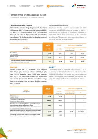 Laporan ManajemenManagement ReportProfil PerusahaanCompany ProfileAnalisa & Diskusi ManajemenManagement Discussion & AnalysisIkhtisar 20202020 HighlightsPT Pertamina Hulu Energi2020 Laporan Tahunan TerintegrasiIntegrated Annual Report 242Employee benefits liabilitiesEmployee Benefits Liabilities on December 31, 2020 amounted to USD71.09 million, an increase of USD5.61 million or 8.57% compared to 2019 which amounted to USD71.09 million. This is influenced by the additional provision for PSL expenses in the current year based on the 2020 actuarial report estimates.EQUITY Total Equity as per 31 December 2020 was USD2,771.73, a decrease of USD373.30 million or 13.18% compared to USD2,831.95 million. This decline was mainly influenced by the company%u2019s performance where the company was only able to book profit of the year USD223.96 million.LAPORAN POSISI KEUANGAN KONSOLIDASIANConsolidated Statements of Financial PositionLiabilitas imbalan kerja karyawanNilai Liabilitas imbalan kerja karyawan 31 Desember 2020 sebesar USD71,09 juta, meningkat sebesar USD5,61 juta atau 8,57% dibanding tahun 2019 yang sebesar USD71,09 juta. Hal ini dipengaruhi oleh penambahan provisi beban PSL di tahun berjalan berdasarkan estimasi laporan aktuari tahun 2020.UraianDescription2020 2019 Pertumbuhan | GrowthJuta USDMillion USDJuta USDMillion USDJumlah (juta USD)Amount (Million USD) %PerusahaanThe Company 37,64 28,01 9,63 34,40Entitas AnakSubsidiaries 33,45 37,47 (4,02) (10,73)Jumlah Liabilitas imbalan kerja karyawannTotal Employee benefits liabilities 71,09 65,48 5,61 8,57EKUITAS Jumlah Ekuitas per 31 Desember 2020 sebesar USD2.771,73 juta, menurun sebesar USD373,30 juta atau 13,18% dibanding tahun 2019 yang sebesar USD2.831,95 juta. Penurunan ini terutama dipengaruhi oleh kinerja perusahaan dimana perusahaan hanya dapat membukukan laba di tahun berjalan sebesar USD223.96 juta.UraianDescription2020 2019 Pertumbuhan | GrowthJuta USDMillion USDJuta USDMillion USDJumlah (juta USD)Amount (Million USD) %Modal SahamShare Capital 53,58 53,58 - -Tambahan Modal DisetorAdditional Paid-In Capital (18,18) (18,18) - -Selisih Kurs Karena Penjabaran Laporan Keuangan Konsolidasian dalam Mata Uang AsingDifferences Arising from Translation of Foreign Currency in Consolidated Financial Statements(1,00) (1,00) - -Pengukuran Kembali Atas Liabilitas Imbalan Pasti NetoRemeasurement of Net Defined Benefit Liabilities 10,33 (0,23) 10,56 (4.672,12)Cadangan Penyesuaian Nilai Wajar %u2013 Setelah PajakReserve for Fair Value Adjustment %u2014 Net of Tax (1,00) (1,00) - -