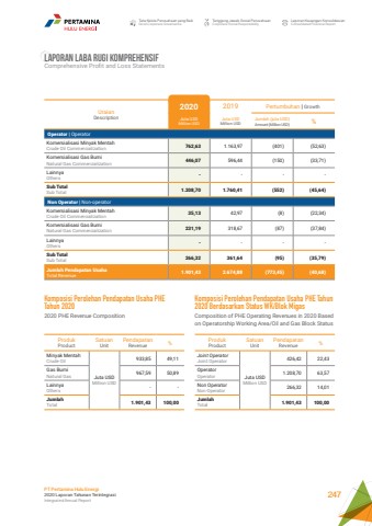 Tata Kelola Perusahaan yang BaikGood Corporate GovernanceTanggung Jawab Sosial PerusahaanCorporate Social ResponsibilityLaporan Keuangan KonsolidasianConsolidated Financial ReportPT Pertamina Hulu Energi2020 Laporan Tahunan TerintegrasiIntegrated Annual Report 247LAPORAN LABA RUGI KOMPREHENSIF Comprehensive Profit and Loss StatementsKomposisi Perolehan Pendapatan Usaha PHE Tahun 20202020 PHE Revenue CompositionKomposisi Perolehan Pendapatan Usaha PHE Tahun 2020 Berdasarkan Status WK/Blok MigasComposition of PHE Operating Revenues in 2020 Based on Operatorship Working Area/Oil and Gas Block StatusUraianDescription2020 2019 Pertumbuhan | GrowthJuta USDMillion USDJuta USDMillion USDJumlah (juta USD)Amount (Million USD) %Operator | OperatorKomersialisasi Minyak MentahCrude Oil Commercialization 762,63 1.163,97 (401) (52,63)Komersialisasi Gas BumiNatural Gas Commercialization 446,07 596,44 (150) (33,71)Lainnya Others - - - -Sub TotalSub Total 1.208,70 1.760,41 (552) (45,64)Non Operator | Non-operatorKomersialisasi Minyak MentahCrude Oil Commercialization 35,13 42,97 (8) (22,34)Komersialisasi Gas BumiNatural Gas Commercialization 231,19 318,67 (87) (37,84)Lainnya Others - - - -Sub TotalSub Total 266,32 361,64 (95) (35,79)Jumlah Pendapatan UsahaTotal Revenue 1.901,43 2.674,88 (773,45) (40,68)ProdukProductSatuanUnitPendapatanRevenue %Minyak MentahCrude OilJuta USDMillion USD933,85 49,11Gas BumiNatural Gas 967,59 50,89LainnyaOthers - -JumlahTotal 1.901,43 100,00ProdukProductSatuanUnitPendapatanRevenue %Joint OperatorJoint OperatorJuta USDMillion USD426,42 22,43OperatorOperator 1.208,70 63,57Non OperatorNon-Operator 266,32 14,01JumlahTotal 1.901,43 100,00