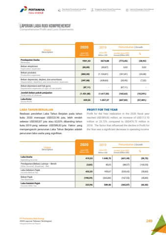 Tata Kelola Perusahaan yang BaikGood Corporate GovernanceTanggung Jawab Sosial PerusahaanCorporate Social ResponsibilityLaporan Keuangan KonsolidasianConsolidated Financial ReportPT Pertamina Hulu Energi2020 Laporan Tahunan TerintegrasiIntegrated Annual Report 249LAPORAN LABA RUGI KOMPREHENSIF Comprehensive Profit and Loss StatementsPROFIT FOR THE YEAR Profit for the Year realization in the 2020 fiscal year reached USD589.83 million, an increase of USD113.10 million or 23.72% compared to USD476.73 million in 2018. The factor that influenced the decline in Profit for the Year was a significant decrease in operating incomeUraianDescription2020 2019 Pertumbuhan | GrowthJuta USDMillion USDJuta USDMillion USDJumlah (juta USD)Amount (Million USD) %Pendapatan UsahaRevenues 1901,43 2674,88 (773,45) (28,92)Beban eksplorasiExploration expenses (83,89) (83,87) 0,02 0,02Beban produksiProduction expenses (883,00) (1.104,81) (221,81) (20,08)Beban depresiasi, deplesi, dan amortisasiDepreciation, depletion, and amortisation expenses (397,88) (428,83) (30,95) (7,22)Beban depresiasi aset hak gunaDepreciaton expenses of right of use assets (87,11) - (87,11) -Jumlah beban pokok penjualanTotal costs of revenue (1.451,88) (1.617,50) (165,62) (10,24%)Laba KotorGross Profit 449,55 1.057,37 (607,82) (57,48%)LABA TAHUN BERJALAN Realisasi perolehan Laba Tahun Berjalan pada tahun buku 2020 mencapai USD223.96 juta, lebih rendah sebesar USD365,87 juta atau 62,03% dibanding tahun buku 2019 yang sebesar USD589,83 juta. Faktor yang mempengaruhi penurunan Laba Tahun Berjalan adalah penurunan laba usaha yang signifikan.UraianDescription2020 2019 Pertumbuhan | GrowthJuta USDMillion USDJuta USDMillion USDJumlah (juta USD)Amount (Million USD) %Laba UsahaOperating Income 419,23 1.040,72 (621,49) (59,72)Pendapatan/(Beban) Lainnya %u2013 BersihOther Income/ (Expense) - Net (3,02) 85,05 (88,07) (103,55)Laba Sebelum PajakIncome Before Tax 422,25 955,67 (533,42) (55,82)Beban PajakTax Expenses (198,29) (365,84) (167,55) (45,80)Laba Setelah PajakIncome After Tax 223,96 589,83 (365,87) (62,03)