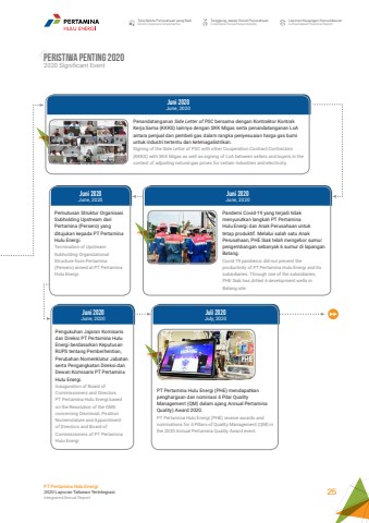 Tata Kelola Perusahaan yang BaikGood Corporate GovernanceTanggung Jawab Sosial PerusahaanCorporate Social ResponsibilityLaporan Keuangan KonsolidasianConsolidated Financial ReportPT Pertamina Hulu Energi2020 Laporan Tahunan TerintegrasiIntegrated Annual Report 25Pengukuhan Jajaran Komisaris dan Direksi PT Pertamina Hulu Energi berdasarkan Keputusan RUPS tentang Pemberhentian, Perubahan Nomenklatur Jabatan serta Pengangkatan Direksi dan Dewan Komisaris PT Pertamina Hulu Energi.Inauguration of Board of Commissioners and Directors PT Pertamina Hulu Energi based on the Resolution of the GMS concerning Dismissal, Position Nomenclature and Appointment of Directors and Board of Commissioners of PT Pertamina Hulu EnergiJuni 2020June, 2020Peristiwa Penting 20202020 Significant EventPenandatanganan Side Letter of PSC bersama dengan Kontraktor Kontrak Kerja Sama (KKKS) lainnya dengan SKK Migas serta penandatanganan LoA antara penjual dan pembeli gas dalam rangka penyesuaian harga gas bumi untuk industri tertentu dan ketenagalistrikan. Signing of the Side Letter of PSC with other Cooperation Contract Contractors (KKKS) with SKK Migas as well as signing of LoA between sellers and buyers in the context of adjusting natural gas prices for certain industries and electricity. Pandemi Covid-19 yang terjadi tidak menyurutkan langkah PT Pertamina Hulu Energi dan Anak Perusahaan untuk tetap produktif. Melalui salah satu Anak Perusahaan, PHE Siak telah mengebor sumur pengembangan sebanyak 6 sumur di lapangan Batang. Covid-19 pandemic did not prevent the productivity of PT Pertamina Hulu Energi and its subsidiaries. Through one of the subsidiaries, PHE Siak has drilled 6 development wells in Batang site. Juni 2020June, 2020Juni 2020June, 2020Pemutusan Struktur Organisasi Subholding Upstream dari Pertamina (Persero) yang ditujukan kepada PT Pertamina Hulu Energi.Termination of Upstream Subholding Organizational Structure from Pertamina (Persero) aimed at PT Pertamina Hulu Energi.Juni 2020June, 2020PT Pertamina Hulu Energi (PHE) mendapatkan penghargaan dan nominasi 4 Pilar Quality Management (QM) dalam ajang Annual Pertamina Quality) Award 2020.PT Pertamina Hulu Energi (PHE) receive awards and nominations for 4 Pillars of Quality Management (QM) in the 2020 Annual Pertamina Quality Award event.Juli 2020July, 2020