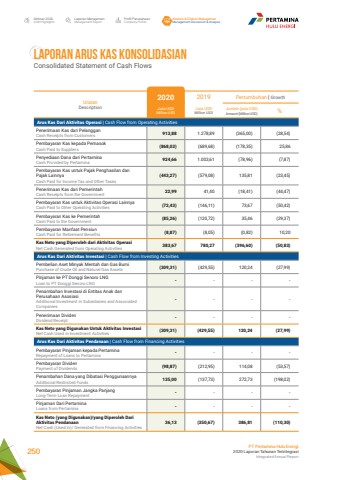 Laporan ManajemenManagement ReportProfil PerusahaanCompany ProfileAnalisa & Diskusi ManajemenManagement Discussion & AnalysisIkhtisar 20202020 HighlightsPT Pertamina Hulu Energi2020 Laporan Tahunan TerintegrasiIntegrated Annual Report 250LAPORAN ARUS KAS KONSOLIDASIAN Consolidated Statement of Cash FlowsUraianDescription2020 2019 Pertumbuhan | GrowthJuta USDMillion USDJuta USDMillion USDJumlah (juta USD)Amount (Million USD) %Arus Kas Dari Aktivitas Operasi | Cash Flow from Operating ActivitiesPenerimaan Kas dari PelangganCash Receipts from Customers 913,88 1.278,89 (365,00) (28,54)Pembayaran Kas kepada PemasokCash Paid to Suppliers (868,03) (689,68) (178,35) 25,86Penyediaan Dana dari PertaminaCash Provided by Pertamina 924,66 1.003,61 (78,96) (7,87)Pembayaran Kas untuk Pajak Penghasilan dan Pajak LainnyaCash Paid for Income Tax and Other Taxes(443,27) (579,08) 135,81 (23,45)Penerimaan Kas dari PemerintahCash Receipts from the Government 22,99 41,40 (18,41) (44,47)Pembayaran Kas untuk Aktivitas Operasi LainnyaCash Paid to Other Operating Activities (72,43) (146,11) 73,67 (50,42)Pembayaran Kas ke PemerintahCash Paid to the Government (85,26) (120,72) 35,46 (29,37)Pembayaran Manfaat PensiunCash Paid for Retirement Benefits (8,87) (8,05) (0,82) 10,20Kas Neto yang Diperoleh dari Aktivitas OperasiNet Cash Generated from Operating Activities 383,67 780,27 (396,60) (50,83)Arus Kas Dari Aktivitas Investasi | Cash Flow from Investing ActivitiesPembelian Aset Minyak Mentah dan Gas BumiPurchase of Crude Oil and Natural Gas Assets (309,31) (429,55) 120,24 (27,99)Pinjaman ke PT Donggi Senoro LNGLoan to PT Donggi Senoro LNG - - - -Penambahan Investasi di Entitas Anak dan Perusahaan AsosiasiAdditional Investment in Subsidiaries and Associated Companies- - - -Penerimaan Dividen Dividend Receipt - - - -Kas Neto yang Digunakan Untuk Aktivitas InvestasiNet Cash Used in Investment Activities (309,31) (429,55) 120,24 (27,99)Arus Kas Dari Aktivitas Pendanaan | Cash Flow from Financing ActivitiesPembayaran Pinjaman kepada PertaminaRepayment of Loans to Pertamina - - - -Pembayaran DividenPayment of Dividends (98,87) (212,95) 114,08 (53,57)Penambahan Dana yang Dibatasi PenggunaannyaAdditional Restricted Funds 135,00 (137,73) 272,73 (198,02)Pembayaran Pinjaman Jangka PanjangLong-Term Loan Repayment - - - -Pinjaman Dari PertaminaLoans from Pertamina - - - -Kas Neto (yang Digunakan)/yang Diperoleh Dari Aktivitas PendanaanNet Cash (Used in)/ Generated from Financing Activities36,13 (350,67) 386,81 (110,30)