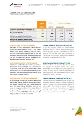 Tata Kelola Perusahaan yang BaikGood Corporate GovernanceTanggung Jawab Sosial PerusahaanCorporate Social ResponsibilityLaporan Keuangan KonsolidasianConsolidated Financial ReportPT Pertamina Hulu Energi2020 Laporan Tahunan TerintegrasiIntegrated Annual Report 251LAPORAN ARUS KAS KONSOLIDASIANConsolidated Statement of Cash FlowsUraianDescription2020 2019 Pertumbuhan | GrowthJuta USDMillion USDJuta USDMillion USDJumlah (juta USD)Amount (Million USD) %(Penurunan) / Kenaikan Neto Kas dan Setara kasNet (Decrease)/ Increase in Cash and Cash Equivalents 110,49 0,05 110,44 230.085,42Efek Perubahan Nilai KursEffect of Exchange Rate Changes 11,78 6,44 5,35 83,01Saldo Kas dan Setara Kas Pada Awal TahunCash and Cash Equivalents at the Beginning of the Year 223,74 217,25 6,49 2,99Saldo Kas dan Setara Kas Pada Akhir TahunCash and Cash Equivalents at the End of the Year 346,01 223,74 122,27 54,65CASH FLOW FROM OPERATING ACTIVITIES In 2020, PHE recorded a Cash Flow from Operating Activities of USD383.67 million. The value decreased by USD396.60 million or 50.83% compared to USD780.27 million in 2019. This was mainly due to a decrease in cash receipts from customers as well as cash payments to suppliers that were larger than in 2019.CASH FLOW FOR INVESTING ACTIVITIES Total Cash Flow from Investing Activities in 2020 was recorded at USD309.31 million. The number decreased by USD120.24 million or 27.99% compared to USD429.55 million in 2019. The factor affecting this is the rescheduling of 2020 investment activities due to the impact of the Covid-19 pandemic.CASH FLOW FROM FINANCING ACTIVITIES Total Cash Flow from Financing Activities in 2020 was recorded at USD36.13 million. The value increased by USD386.81 million or 110.30% compared to USD350.67 million in 2019. This is due to the addition of Restricted Funds from the realization of cash settlement of PT PHE Oil and Gas BV%u2019s Long Term Loan Liabilities to PT PHE which was carried out in December 2020.ARUS KAS DARI AKTIVITAS OPERASI Pada tahun 2020 PHE mencatatkan jumlah Arus Kas dari Aktivitas Operasi sebesar USD383,67 juta. Jumlah tersebut turun sebesar USD396,60 juta atau 50,83% dibanding tahun 2019 yang sebesar US780,27 juta. Hal ini terutama disebabkan adanya penurunan Penerimaan Kas Dari Pelanggan serta adanya pembayaran kas kepada pemasok lebih besar dari tahun 2019.ARUS KAS UNTUK AKTIVITAS INVESTASI Jumlah Arus Kas Dari Aktivitas Investasi pada tahun 2020 tercatat sebesar USD309,31 juta. Jumlah tersebut turun USD120,24 juta atau 27,99% dibanding tahun 2019 sebesar USD429,55 juta. Faktor yang mempengaruhi hal ini terutama adanya reschedule kegiatan investasi 2020 karen dampak pandemic Covid-19.ARUS KAS DARI AKTIVITAS PENDANAAN Jumlah Arus Kas Dari Aktivitas Pendanaan pada tahun 2020 tercatat sebesar USD36,13 juta. Jumlah tersebut naik sebesar USD386,81 juta atau 110,30% dibanding tahun 2019 yang sebesar USD350,67 juta. Hal ini terutama adanya penambahan Dana yang Dibatasi Penggunaannya dari realisasi cash settlement atas Long Term Loan Liabilities PT PHE Oil and Gas BV kepada PT PHE yang dilakukan pada Desember 2020.
