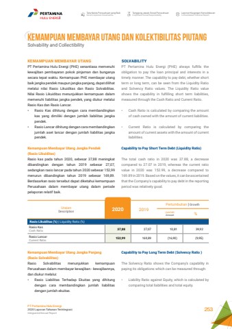 Tata Kelola Perusahaan yang BaikGood Corporate GovernanceTanggung Jawab Sosial PerusahaanCorporate Social ResponsibilityLaporan Keuangan KonsolidasianConsolidated Financial ReportPT Pertamina Hulu Energi2020 Laporan Tahunan TerintegrasiIntegrated Annual Report 253KEMAMPUAN MEMBAYAR UTANG DAN KOLEKTIBILITAS PIUTANGSolvability and CollectibilitySOLVABILITYPT Pertamina Hulu Energi (PHE) always fulfills the obligation to pay the loan principal and interests in a timely manner. The capability to pay debt, whether short term or long term, can be seen from the Liquidity Ratio and Solvency Ratio values. The Liquidity Ratio value shows the capability in fulfilling short term liabilities, measured through the Cash Ratio and Current Ratio. %u2022 Cash Ratio is calculated by comparing the amount of cash owned with the amount of current liabilities. %u2022 Current Ratio is calculated by comparing the amount of current assets with the amount of current liabilities. Capability to Pay Short Term Debt (Liquidity Ratio) The total cash ratio in 2020 was 37.88, a decrease compared to 27.07 in 2019, whereas the current ratio value in 2020 was 152.99, a decrease compared to 169.89 in 2019. Based on the values, it can be ascertained that the Company%u2019s capability to pay debt in the reporting period was relatively good.Capability to Pay Long Term Debt (Solvency Ratio )The Solvency Ratio shows the Company%u2019s capability in paying its obligations which can be measured through: %u2022 Liability Ratio against Equity, which is calculated by comparing total liabilities and total equity. KEMAMPUAN MEMBAYAR UTANGPT Pertamina Hulu Energi (PHE) senantiasa memenuhi kewajiban pembayaran pokok pinjaman dan bunganya secara tepat waktu. Kemampuan PHE membayar utang baik jangka pendek maupun jangka panjang, dapat dilihat melalui nilai Rasio Likuiditas dan Rasio Solvabilitas. Nilai Rasio Likuiditas menunjukkan kemampuan dalam memenuhi liabilitas jangka pendek, yang diukur melalui Rasio Kas dan Rasio Lancar. %u2022 Rasio Kas dihitung dengan cara membandingkan kas yang dimiliki dengan jumlah liabilitas jangka pendek. %u2022 Rasio Lancar dihitung dengan cara membandingkan jumlah aset lancar dengan jumlah liabilitas jangka pendek.Kemampuan Membayar Utang Jangka Pendek (Rasio Likuiditas) Rasio kas pada tahun 2020, sebesar 37,88 meningkat dibandingkan dengan tahun 2019 sebesar 27,07, sedangkan rasio lancar pada tahun 2020 sebesar 152,99 menurun dibandingkan tahun 2019 sebesar 169,89. Berdasarkan rasio tersebut dapat diketahui kemampuan Perusahaan dalam membayar utang dalam periode pelaporan relatif baik.UraianDescription 2020 2019Pertumbuhan | GrowthJumlah Amount %Rasio Likuiditas (%) | Liquidity Ratio (%)Rasio KasCash Ratio 37,88 27,07 10,81 39,92Rasio LancarCurrent Ratio 152,99 169,89 (16,90) (9,95)Kemampuan Membayar Utang Jangka Panjang (Rasio Solvabilitas) Rasio Solvabilitas menunjukkan kemampuan Perusahaan dalam membayar kewajiban - kewajibannya, dan diukur melalui: %u2022 Rasio Liabilitas Terhadap Ekuitas yang dihitung dengan cara membandingkan jumlah liabilitas dengan jumlah ekuitas.