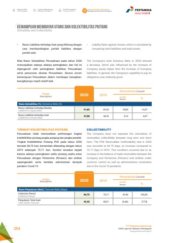 Laporan ManajemenManagement ReportProfil PerusahaanCompany ProfileAnalisa & Diskusi ManajemenManagement Discussion & AnalysisIkhtisar 20202020 HighlightsPT Pertamina Hulu Energi2020 Laporan Tahunan TerintegrasiIntegrated Annual Report 254KEMAMPUAN MEMBAYAR UTANG DAN KOLEKTIBILITAS PIUTANGSolvability and Collectibility%u2022 Liability Ratio against Assets, which is calculated by comparing total liabilities and total assets. The Company%u2019s total Solvency Ratio in 2020 showed a decrease, which was influenced by the increase of Company equity higher than the increase of Company liabilities. In general, the Company%u2019s capability to pay its obligations was relatively good.COLLECTABILITYThe Company does not separate the calculation of receivables collectibility between long term and short term. The PHE Receivables Collectability rate in 2020 was recorded at 84.75 days, an increase compared to 72.17 days in 2019. This condition occurred due to an increase in the balance of trade receivables between the Company and Pertamina (Persero) and entities under common control as well as administrative constraints due to the Covid-19 pandemic.%u2022 Rasio Liabilitas terhadap Aset yang dihitung dengan cara membandingkan jumlah liabilitas dengan jumlah aset. Nilai Rasio Solvabilitas Perusahaan pada tahun 2020 menunjukkan adanya adanya peningkatan, dan hal ini dipengaruhi oleh peningkatan liabilitas Perusahaan serta penurunan ekuitas Perusahaan. Secara umum kemampuan Perusahaan dalam membayar kewajibankewajibannya masih relatif baik. UraianDescription 2020 2019Pertumbuhan | GrowthJumlah Amount %Rasio Solvabilitas (%) | Solvency Ratio (%)Rasio Liabilitas terhadap EkuitasLiabilities to Equity Ratio 91,85 81,02 10,83 13,37Rasio Liabilitas terhadap AsetLiabilities to Assets Ratio 47,88 44,76 3,12 6,97TINGKAT KOLEKTIBILITAS PIUTANGPerusahaan tidak memisahkan perhitungan tingkat kolektibilitas piutang jangka panjang dan jangka pendek. Tingkat Kolektibilitas Piutang PHE pada tahun 2020 tercatat 84,75 hari, bertambah dibanding dengan tahun 2019 sebanyak 72,17 hari. Kondisi tersebut terjadi karena adanya peningkatan saldo piutang usaha antar Perusahaan dengan Pertamina (Persero) dan entitas sepengendali serta kendala administrasi dampak pandemi Covid-19.UraianDescription 2020 2019Pertumbuhan | GrowthJumlah Amount %Rasio Perputaran (Hari) | Turnover Ratio (Days)Collection PeriodCollection Period 84,75 72,17 41,50 135,30Perputaran Total AsetTotal Assets Turnover 42,45 65,21 (5,46) (7,73)