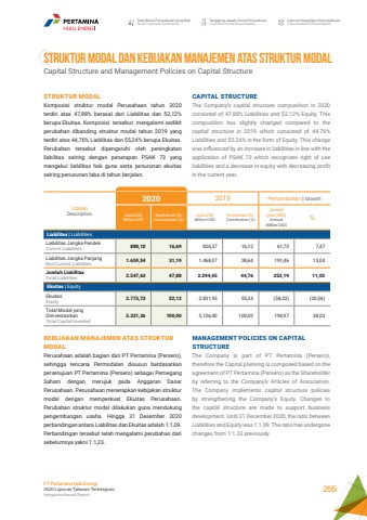 Tata Kelola Perusahaan yang BaikGood Corporate GovernanceTanggung Jawab Sosial PerusahaanCorporate Social ResponsibilityLaporan Keuangan KonsolidasianConsolidated Financial ReportPT Pertamina Hulu Energi2020 Laporan Tahunan TerintegrasiIntegrated Annual Report 255STRUKTUR MODAL DAN KEBIJAKAN MANAJEMEN ATAS STRUKTUR MODALCapital Structure and Management Policies on Capital StructureCAPITAL STRUCTUREThe Company%u2019s capital structure composition in 2020 consisted of 47.88% Liabilities and 52.12% Equity. This composition has slightly changed compared to the capital structure in 2019 which consisted of 44.76% Liabilities and 55.24% in the form of Equity. This change was influenced by an increase in liabilities in line with the application of PSAK 73 which recognizes right of use liabilities and a decrease in equity with decreasing profit in the current year.MANAGEMENT POLICIES ON CAPITAL STRUCTUREThe Company is part of PT Pertamina (Persero), therefore the Capital planning is composed based on the agreement of PT Pertamina (Persero) as the Shareholder by referring to the Company%u2019s Articles of Association. The Company implements capital structure policies by strengthening the Company%u2019s Equity. Changes to the capital structure are made to support business development. Until 31 December 2020, the ratio between Liabilities and Equity was 1:1.09. The ratio has undergone changes from 1:1.23 previously.STRUKTUR MODALKomposisi struktur modal Perusahaan tahun 2020 terdiri atas 47,88% berasal dari Liabilitas dan 52,12% berupa Ekuitas. Komposisi tersebut mengalami sedikit perubahan dibanding struktur modal tahun 2019 yang terdiri atas 44,76% Liabilitas dan 55,24% berupa Ekuitas. Perubahan tersebut dipengaruhi oleh peningkatan liabilitas seiring dengan penerapan PSAK 73 yang mengakui liabilitas hak guna serta penurunan ekuitas seiring penurunan laba di tahun berjalan.UraianDescription2020 2019 Pertumbuhan | GrowthJuta USDMillion USDKontribusi (%)Contribution (%)Juta USDMillion USDKontribusi (%)Contribution (%)Jumlah (juta USD)Amount (Million USD)%Liabilitas | LiabilitiesLiabilitas Jangka PendekCurrent Liabilities 888,10 16,69 826,37 16,12 61,73 7,47Liabilitas Jangka PanjangNon-Current Liabilities 1.659,54 31,19 1.468,07 28,64 191,46 13,04Jumlah LiabilitasTotal Liabilities 2.547,63 47,88 2.294,45 44,76 253,19 11,03Ekuitas | EquityEkuitasEquity 2.773,73 52,12 2.831,95 55,24 (58,22) (20,56)Total Modal yang Diinvestasikan Total Capital Invested5.321,36 100,00 5.126,40 100,00 194,97 38,03KEBIJAKAN MANAJEMEN ATAS STRUKTUR MODALPerusahaan adalah bagian dari PT Pertamina (Persero), sehingga rencana Permodalan disusun berdasarkan persetujuan PT Pertamina (Persero) sebagai Pemegang Saham dengan merujuk pada Anggaran Dasar Perusahaan. Perusahaan menerapkan kebijakan struktur modal dengan memperkuat Ekuitas Perusahaan. Perubahan struktur modal dilakukan guna mendukung pengembangan usaha. Hingga 31 Desember 2020 perbandingan antara Liabilitas dan Ekuitas adalah 1:1,09. Perbandingan tersebut telah mengalami perubahan dari sebelumnya yakni 1:1,23.