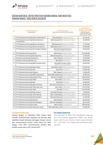 Tata Kelola Perusahaan yang BaikGood Corporate GovernanceTanggung Jawab Sosial PerusahaanCorporate Social ResponsibilityLaporan Keuangan KonsolidasianConsolidated Financial ReportPT Pertamina Hulu Energi2020 Laporan Tahunan TerintegrasiIntegrated Annual Report 257IKATAN MATERIAL UNTUK INVESTASI BARANG MODAL DAN INVESTASI BARANG MODAL YANG DIREALISASIKANMaterial Commitment for Capital Goods Investment and Capital Goods Investment RealizedNo Anak PerusahaanSubsidiariesWK/Blok MigasOperation Area/Oil and Gas BlockKomitmen Program Kerja dan Pengeluaran (USD) Work Program Commitment and Expenditure (USD)1 PT Pertamina Hulu Energi Metana Kalimantan B Blok Sangatta II | Sangatta II Block 20.128.2332 PT Pertamina Hulu Energi Metana Sumatera Tanjung Enim Blok Tanjung Enim | Tanjung Enim Block 14.483.8633 PT Pertamina Hulu Energi Metana Sumatera 2 Blok Muara Enim | Muara Enim Block 11.750.0004 PT Pertamina Hulu Energi Metana Sumatera 5 Blok Muara Enim II | Muara Enim II Block 23.850.0005 PT Pertamina Hulu Energi West Glagah Kambuna Blok West Glagah Kambuna | Blok West Glagah Kambuna55.000.0006 PT Pertamina Hulu Energi Semai Blok Semai II | Semai II Block 214.000.0007 PT Pertamina Hulu Energi Randugunting Blok Randugunting | Randugunting Block 14.100.0008 Pertamina Hulu Energi Ambalat Ltd. Blok Ambalat | Ambalat Block 16.500.0009 Pertamina Hulu Energi Bukat Ltd. Blok Bukat | Bukat Block 48.000.00010 PT Pertamina Hulu Energi MNK Sumatera Utara Blok MNK Sumatera Utara | MNK Sumatera Utara Block84.800.00011 PT Pertamina Hulu Energi Babar Selaru Blok Babar Selaru | Babar Selaru Block 173.000.00012 PT Pertamina Hulu Energi Abar Blok Abar | Abar Block 23.800.00013 PT Pertamina Hulu Energi Anggursi Blok Anggursi | Anggursi Block 15.800.00014 PT Pertamina Hulu Energi MNK Sakakemang Blok MNK Sakakemang | MNK Sakakemang Block 35.850.00015 PT Pertamina Hulu Energi Ambalat Timur Blok East Ambalat | East Ambalat Block 225.000.00016 PT Pertamina Hulu Energi ONWJ Blok ONWJ | ONWJ Block 82.300.00017 PT Pertamina Hulu Energi NSO Blok NSO | NSO Block 43.000.00018 PT Pertamina Hulu Energi Ogan Komering Blok Ogan Komering | Ogan Komering Block 60.600.00019 PT Pertamina Hulu Energi Tuban East Java Blok Tuban | Tuban Block 114.070.00020 PT Pertamina Hulu Energi OSES Blok SES | SES Block 231.000.00021 PT Pertamina Hulu Energi Raja Tempirai Blok Raja/Pendopo | Raja/Pendopo Block 15.550.00022 PT Pertamina Hulu Energi Jambi Merang Blok Jambi Merang | Jambi Merang Block 239.300.00023 PT Pertamina Hulu Energi Salawati Basin Blok Kepala Burung | Kepala Burung Block 61.222.00024 PT Pertamina Hulu Energi Salawati Blok Salawati | Salawati Block 36.250.00025 PT Pertamina Hulu Energi East Sepinggan Blok East Sepinggan | East Sepinggan Block 80.610.00026 PT Pertamina Hulu Energi Corridor Blok Corridor | Corridor Block 250.000.00027 PT Pertamina Hulu Energi South East Jambi Blok South East Jambi | South East Jambi Block 26.400.000Gas Supply Agreement Until December 31 2020, PHE Subsidiaries made gas sale and purchase agreements (PJBG) with several buyers, with the gas volume of each contract between 0.8 %u2013 1,418 TBTU. The contracts will end between 2021 and 2031.Perjanjian Pasokan Gas Sampai dengan 31 Desember 2020, Entitas Anak memiliki kontrak-kontrak perjanjian jual beli gas yang signifikan kepada beberapa pelanggan, dengan volume gas masing-masing kontrak senilai antara 0,8 TBTU hingga 1.418 TBTU. Kontrak-kontrak tersebut akan berakhir antara tahun 2021 sampai 2031.