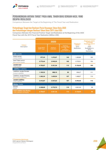 Tata Kelola Perusahaan yang BaikGood Corporate GovernanceTanggung Jawab Sosial PerusahaanCorporate Social ResponsibilityLaporan Keuangan KonsolidasianConsolidated Financial ReportPT Pertamina Hulu Energi2020 Laporan Tahunan TerintegrasiIntegrated Annual Report 259UraianDescription2020Realisasi20192019 RealizationRealisasi 2020 Terhadap Realisasi 2019 (%)2020Realization to 2019RealizationTarget RKAPRKAP TargetRealisasiRealization Realisasi Terhadap RKAP (%)Realizationagainst RKAP (%)Aset | AssetsAsset LancarCurrent Assets 977,22 1.372,07 143 1.403,89 100Aset Tidak LancarNon-current Assets 3.773,64 3.949,29 105 3.722,51 106Jumlah AsetTotal Assets 4.750,87 5.321,36 113 5.126,40 104 Liabilitas | LiabilitiesLiabilitas Jangka PendekCurrent Liabilities 1.109,53 888,10 82 826,37 111Liabilitas Jangka PanjangNon-Current Liabilities 1.303,34 1.659,54 127 1.468,07 113Jumlah LiabilitasTotal Liabilities 2.412,87 2.547,63 107 2.294,45 112Ekuitas | EquityEkuitasEquity 2.338,00 2.773,73 119 2.831,95 98Total Liabilitas dan Ekuitas Total Liabilities and Equity 4.750,87 5.321.36 112 5.126,40 96Perbandingan Target dan Realisasi Posisi Keuangan Tahun Buku 2020 dan Perbandingan dengan Realisasi Tahun Buku 2019 (Juta USD)Comparison Between the Financial Position Target and Realization at the Beginning of the 2020 Fiscal Year with the 2019 Fiscal Year Realization (Million USD)PERBANDINGAN ANTARA TARGET PADA AWAL TAHUN BUKU DENGAN HASIL YANG DICAPAI (REALISASI)Comparison Between the Target at the Beginning of The Fiscal Year and Realization