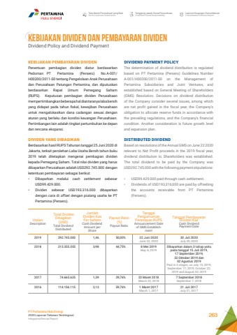 Tata Kelola Perusahaan yang BaikGood Corporate GovernanceTanggung Jawab Sosial PerusahaanCorporate Social ResponsibilityLaporan Keuangan KonsolidasianConsolidated Financial ReportPT Pertamina Hulu Energi2020 Laporan Tahunan TerintegrasiIntegrated Annual Report 263KEBIJAKAN DIVIDEN DAN PEMBAYARAN DIVIDENDividend Policy and Dividend PaymentDIVIDEND PAYMENT POLICYThe determination of dividend distribution is regulated based on PT Pertamina (Persero) Guidelines Number A-001/H00200/2011-S0 on the Management of Pertamina Subsidiaries and Joint Ventures, and established based on General Meeting of Shareholders (GMS) Resolution. Decisions on dividend distribution of the Company consider several issues, among which are net profit gained in the fiscal year, the Company%u2019s obligation to allocate reserve funds in accordance with the prevailing regulations, and the Company%u2019s financial condition. Another consideration is future growth level and expansion plan.DISTRIBUTED DIVIDENDBased on resolutions of the Annual GMS on June 22 2020 relevant to Net Profit proceeds in the 2019 fiscal year, dividend distribution to Shareholders was established. The total dividend to be paid by the Company was USD292.745.000 with the following payment stipulations: %u2022 USD99.429.000 paid through cash settlement. %u2022 Dividends of USD193,316,000 are paid by offsetting the accounts receivable from PT Pertamina (Persero).KEBIJAKAN PEMBAYARAN DIVIDENPenentuan pembagian dividen diatur berdasarkan Pedoman PT Pertamina (Persero) No.A-001/H00200/2011-S0 tentang Pengelolaan Anak Perusahaan dan Perusahaan Patungan Pertamina, dan diputuskan berdasarkan Rapat Umum Pemegang Saham (RUPS). Keputusan pembagian dividen Perusahaan mempertimbangkan beberapa hal diantaranya laba bersih yang didapat pada tahun fiskal, kewajiban Perusahaan untuk mengalokasikan dana cadangan sesuai dengan aturan yang berlaku dan kondisi keuangan Perusahaan. Pertimbangan lain adalah tingkat pertumbuhan ke depan dan rencana ekspansi.DIVIDEN YANG DIBAGIKANBerdasarkan hasil RUPS Tahunan tanggal 25 Juni 2020 di Jakarta, terkait perolehan Laba Usaha Bersih tahun buku 2019 telah ditetapkan mengenai pembagian dividen kepada Pemegang Saham. Total nilai dividen yang harus dibayarkan Perusahaan adalah USD292.745.000 dengan ketentuan pembayaran sebagai berikut:%u2022 Dibayarkan melalui cash settlement sebesar USD99.429.000.%u2022 Dividen sebesar USD193.316.000 dibayarkan dengan cara di offset dengan piutang usaha ke PT Pertamina (Persero).UraianDescription Total Dividen Dibagikan(USD)Total Dividend Distributed Jumlah Dividen Kas Per SahamCash DividendAmount per SharePayout Ratio (%)Payout RatioTanggal PengumumanPenetapan RUPSAnnouncement Date of GMS EstablishmentTanggal Pembayaran Dividen KasCash Dividend Payment Date2019 292.745.000 1,46 50,00% 22 Juni 2020June 22, 202030 Juli 2020July 30, 20202018 213.355.355 3,98 44,75% 8 Mei 2019May 8, 2019Dibayarkan dalam 3 tahap yaitu pada tanggal 15 Juli 2019, 17 September 2019, 22 Oktober 2019 dan 02 Agustus 2019Paid in 3 stages, on July 15, 2019, September 17, 2019, October 22, 2019 and August 02, 20192017 74.665.625 1,39 29,76% 22 Maret 2018March 22, 20187 September 2018September 7, 20182016 114.156.115 2,13 59,76% 1 Maret 2017March 1, 201721 Juli 2017July 21, 2017