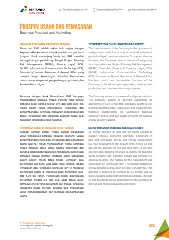 Tata Kelola Perusahaan yang BaikGood Corporate GovernanceTanggung Jawab Sosial PerusahaanCorporate Social ResponsibilityLaporan Keuangan KonsolidasianConsolidated Financial ReportPT Pertamina Hulu Energi2020 Laporan Tahunan TerintegrasiIntegrated Annual Report 265PROSPEK USAHA DAN PEMASARANBusiness Prospect and MarketingDESCRIPTION ON BUSINESS PROSPECTThe core business of the Company is the upstream oil and gas sector with final activity of crude oil and natural gas (oil and gas) commercialization. To support the core business, the Company owns a number of supporting functions, which are: Project Planning Risk Management (PPRM), Controller, Finance & Treasury, Legal, SCM, QHSSE, Information Communication Technology (ICT), Commercial, Human Resources & General Affair Functions which are the enabler functions of the Company in the oil and gas exploration, development, production, and commercialization processes.The Company strives to increase oil and gas production. The potential owned is deemed substantial as approximately 59% of the total Company assets is still in non-production stage (exploration and development), therefore guaranteeing the Company%u2019s business continuity and oil and gas supply certainty for national energy security support.Energy Demand in Indonesia Continues to GrowAs energy sources, oil and gas are highly needed to support various economic activities. Endeavors in new and renewable energy and energy conservation (EBTKE) development still require time, hence oil and gas are the solution for mid and long term. In the next several years, demand for crude oil, mainly for domestic needs remains high. Similarly, natural gas demand will continue to grow. The Agency for the Assessment and Application of Technology (BPPT) recorded Indonesia%u2019s energy demand to grow at an average 4.3% per year. This demand is expected to increase to 3.2 million BOE by 2035, including energy derived from oil and gas. The high oil and gas needs are an opportunity for the Company to develop and maintain business continuity.URAIAN TENTANG PROSPEK USAHABisnis inti PHE adalah sektor hulu migas dengan kegiatan akhir komersial minyak mentah dan gas bumi (migas). Untuk menunjang bisnis inti, PHE memiliki berbagai fungsi pendukung: Fungsi Project Planning Risk Management (PPRM), Finance, Legal, SCM, QHSSE, Informatioan Communication Technologi (ICT), Commercial, Human Resouces & General Affair yang menjadi fungsi kewenangan (enabler) Perusahaan dalam proses eksplorasi, pengembangan, produksi, dan komersialisasi migas. Bersama dengan Anak Perusahaan, PHE berupaya meningkatkan produksi migas. Potensi yang dimiliki terbilang besar karena sekitar 59% dari total aset PHE masih dalam tahap non-produksi (eksplorasi dan pengembangan), sehingga menjamin keberlangsungan bisnis Perusahaan dan kepastian pasokan migas bagi dukungan ketahanan energi nasional.Permintaan Energi Di Indonesia Terus TumbuhSebagai sumber energi, migas sangat dibutuhkan untuk mendukung berbagai kegiatan ekonomi. Upaya pengembangan energi baru, terbarukan dam konservasi energi (EBTKE) masih membutuhkan waktu, sehingga migas menjadi solusi untuk jangka menengah dan panjang. Dalam beberapa tahun mendatang, permintaan terhadap minyak mentah terutama untuk kebutuhan dalam negeri masih tetap tinggi. Demikian pula permintaan gas bumi juga akan terus tumbuh. Badan Pengkajian dan Penerapan Teknologi (BPPT) mencatat permintaan energi di Indonesia akan bertumbuh ratarata 4,3% per tahun. Permintaan energi diperkirakan bertambah hingga 3,2 juta BOE pada tahun 2035, termasuk energi yang bersumber dari migas. Tingginya kebutuhan migas menjadi peluang bagi Perusahaan untuk mengembangkan dan menjaga kesinambungan usaha.