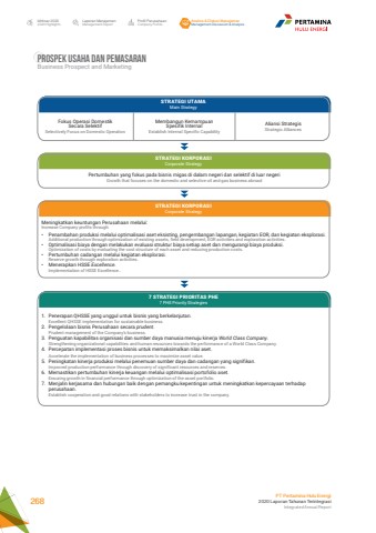 Fokus Operasi Domestik Secara SelektifSelectively Focus on Domestic Operation1. Penerapan QHSSE yang unggul untuk bisnis yang berkelanjutan.Excellent QHSSE implementation for sustainable business.2. Pengelolaan bisnis Perusahaan secara prudent.Prudent management of the Company's business.3. Penguatan kapabilitas organisasi dan sumber daya manusia menuju kinerja World Class Company.Strengthening organizational capabilities and human resources towards the performance of a World Class Company.4. Percepatan implementasi proses bisnis untuk memaksimalkan nilai aset.Accelerate the implementation of business processes to maximize asset value.5. Peningkatan kinerja produksi melalui penemuan sumber daya dan cadangan yang signifikan.Improved production performance through discovery of significant resources and reserves.6. Memastikan pertumbuhan kinerja keuangan melalui optimalisasi portofolio aset.Ensuring growth in financial performance through optimization of the asset portfolio.7. Menjalin kerjasama dan hubungan baik dengan pemangku kepentingan untuk meningkatkan kepercayaan terhadap perusahaan.Establish cooperation and good relations with stakeholders to increase trust in the company.Pertumbuhan yang fokus pada bisnis migas di dalam negeri dan selektif di luar negeriGrowth that focuses on the domestic and selective oil and gas business abroadMeningkatkan keuntungan Perusahaan melalui:Increase Company profits through:%u2022 Penambahan produksi melalui optimalisasi aset eksisting, pengembangan lapangan, kegiatan EOR, dan kegiatan eksplorasi.Additional production through optimization of existing assets, field development, EOR activities and exploration activities.%u2022 Optimalisasi biaya dengan melakukan evaluasi struktur biaya setiap aset dan mengurangi biaya produksi.Optimization of costs by evaluating the cost structure of each asset and reducing production costs.%u2022 Pertumbuhan cadangan melalui kegiatan eksplorasi.Reserve growth through exploration activities.%u2022 Menerapkan HSSE Excellence.Implementation of HSSE Excellence..Aliansi StrategisStrategic AlliancesMembangun Kemampuan Spesifik InternalEstablish Internal Specific CapabilitySTRATEGI UTAMAMain StrategySTRATEGI KORPORASICorporate StrategySTRATEGI KORPORASICorporate Strategy7 STRATEGI PRIORITAS PHE7 PHE Priority StrategiesLaporan ManajemenManagement ReportProfil PerusahaanCompany ProfileAnalisa & Diskusi ManajemenManagement Discussion & AnalysisIkhtisar 20202020 HighlightsPT Pertamina Hulu Energi2020 Laporan Tahunan TerintegrasiIntegrated Annual Report 268PROSPEK USAHA DAN PEMASARANBusiness Prospect and Marketing
