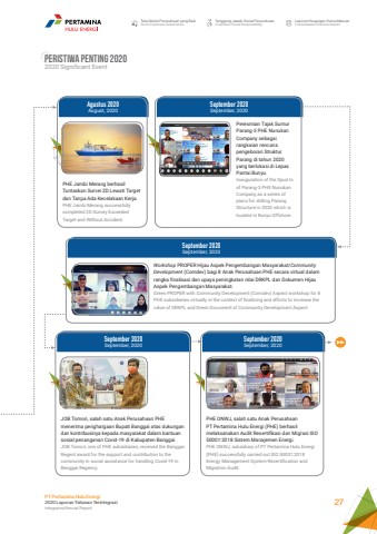 Tata Kelola Perusahaan yang BaikGood Corporate GovernanceTanggung Jawab Sosial PerusahaanCorporate Social ResponsibilityLaporan Keuangan KonsolidasianConsolidated Financial ReportPT Pertamina Hulu Energi2020 Laporan Tahunan TerintegrasiIntegrated Annual Report 27Peristiwa Penting 20202020 Significant EventWorkshop PROPER Hijau Aspek Pengembangan Masyarakat/Community Development (Comdev) bagi 8 Anak Perusahaan PHE secara virtual dalam rangka finalisasi dan upaya peningkatan nilai DRKPL dan Dokumen Hijau Aspek Pengembangan Masyarakat.Green PROPER with Community Development (Comdev) Aspect workshop for 8 PHE subsidiaries virtually in the context of finalizing and efforts to increase the value of DRKPL and Green Document of Community Development AspectSeptember 2020September, 2020PHE Jambi Merang berhasil Tuntaskan Survei 2D Lewati Target dan Tanpa Ada Kecelakaan Kerja.PHE Jambi Merang successfully completed 2D Survey Exceeded Target and Without Accident.Agustus 2020August, 2020Peresmian Tajak Sumur Parang-3 PHE Nunukan Company sebagai rangkaian rencana pengeboran Struktur Parang di tahun 2020 yang berlokasi di Lepas Pantai Bunyu.Inauguration of the Spud In of Parang-3 PHE Nunukan Company as a series of plans for drilling Parang Structure in 2020 which is located in Bunyu Offshore.September 2020September, 2020JOB Tomori, salah satu Anak Perusahaan PHE menerima penghargaan Bupati Banggai atas dukungan dan kontribusinya kepada masyarakat dalam bantuan sosial penanganan Covid-19 di Kabupaten Banggai.JOB Tomori, one of PHE subsidiaries, received the Banggai Regent award for the support and contribution to the community in social assistance for handling Covid-19 in Banggai Regency.PHE ONWJ, salah satu Anak Perusahaan PT Pertamina Hulu Energi (PHE) berhasil melaksanakan Audit Resertifikasi dan Migrasi ISO 50001:2018 Sistem Manajemen Energi.PHE ONWJ, subsidiary of PT Pertamina Hulu Energi (PHE) successfully carried out ISO 50001:2018 Energy Management System Recertification and Migration Audit.September 2020September, 2020September 2020September, 2020
