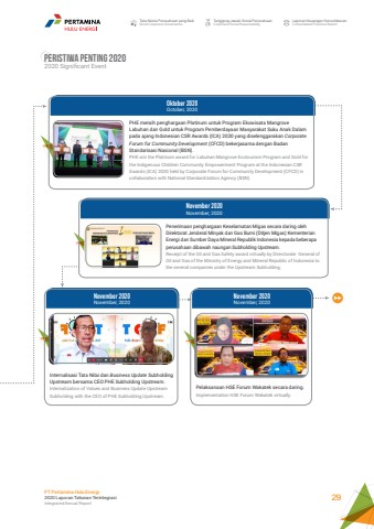 Tata Kelola Perusahaan yang BaikGood Corporate GovernanceTanggung Jawab Sosial PerusahaanCorporate Social ResponsibilityLaporan Keuangan KonsolidasianConsolidated Financial ReportPT Pertamina Hulu Energi2020 Laporan Tahunan TerintegrasiIntegrated Annual Report 29Peristiwa Penting 20202020 Significant EventPHE meraih penghargaan Platinum untuk Program Ekowisata Mangrove Labuhan dan Gold untuk Program Pemberdayaan Masyarakat Suku Anak Dalam pada ajang Indonesian CSR Awards (ICA) 2020 yang diselenggarakan Corporate Forum for Community Development (CFCD) bekerjasama dengan Badan Standarisasi Nasional (BSN).PHE win the Platinum award for Labuhan Mangrove Ecotourism Program and Gold for the Indigenous Children Community Empowerment Program at the Indonesian CSR Awards (ICA) 2020 held by Corporate Forum for Community Development (CFCD) in collaboration with National Standardization Agency (BSN).Oktober 2020October, 2020Penerimaan penghargaan Keselamatan Migas secara daring oleh Direktorat Jenderal Minyak dan Gas Bumi (Ditjen Migas) Kementerian Energi dan Sumber Daya Mineral Republik Indonesia kepada beberapa perusahaan dibawah naungan Subholding Upstream.Receipt of the Oil and Gas Safety award virtually by Directorate General of Oil and Gas of the Ministry of Energy and Mineral Republic of Indonesia to the several companies under the Upstream Subholding.November 2020November, 2020Internalisasi Tata Nilai dan Business Update Subholding Upstream bersama CEO PHE Subholding Upstream.Internalization of Values and Business Update Upstream Subholding with the CEO of PHE Subholding Upstream.Pelaksanaan HSE Forum Wakatek secara daring.Implementation HSE Forum Wakatek virtually.November 2020November, 2020November 2020November, 2020