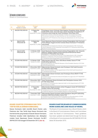 Laporan ManajemenManagement ReportProfil PerusahaanCompany ProfileAnalisa & Diskusi ManajemenManagement Discussion & AnalysisIkhtisar 20202020 HighlightsPT Pertamina Hulu Energi2020 Laporan Tahunan TerintegrasiIntegrated Annual Report 334Dewan komisarisBoard of CommissionersBOARD CHARTER (BOARD OF COMMISSIONERSWORK GUIDELINES AND RULES OF WORK)The Board of Commissioners has a Board Charter, which is the Board of Commissioners Charter and Committees under the Board of Commissioners. These guidelines have been updated and determined through the Decree of the Board of Commissioners No.087/DKPHE/2015-S0 dated 30 December 2015.BOARD CHARTER (PEDOMAN DAN TATA TERTIB KERJA DEWAN KOMISARIS)Dewan Komisaris telah memiliki Board Charter, yaitu Pedoman dan Tata Tertib Kerja Dewan Komisaris dan Komite-komite yang berada di bawah Dewan Komisaris. Pedoman tersebut telah diperbaharui dan ditetapkan melalui Surat Keputusan Dewan Komisaris No.087/DKPHE/2015-S0 tanggal 30 Desember 2015. [102-16]No Nomor SuratNumber of LetterTanggalDatePerihalSubject9 044/DK-PHE/2020-S0 10 September 2020September 10, 2020Persetujuan Owner%u2019s Estimate Paket Kegiatan Pengadaan Kantor Akuntan Publik (KAP) untuk Jasa Audit atas Laporan Keuangan Konsolidasian PT Pertamina Hulu Energi dan Anak Perusahaan Tahun Buku 2020.Approval of Owner's Estimate Package of Public Accountant Firm (KAP) Procurement Activities for Audit Services for the Consolidated Financial Statements of PT Pertamina Hulu Energi and Subsidiaries for the Fiscal Year 2020.10 Kpts-012/DKPHE/2020-S816 September 2020September 16, 2020Surat Keputusan Dewan Komisaris tentang Pengangkatan Sdr. Erwinsyah Putra Sebagai Anggota Komite Investasi Dewan Komisaris PT Pertamina Hulu Energi.The Board of Commissioners Decree on the Appointment of Mr. Erwinsyah Putra As Member of the Investment Committee of PT Pertamina Hulu Energi Board of Commissioners.11 Kpts-013/DKPHE/2020-S812 Oktober 2020October 12, 2020Surat Keputusan Dewan Komisaris tentang Pengangkatan Sdr. Areiyando Makmun sebagai Anggota Komite Nominasi & Remunerasi Dewan Komisaris PT Pertamina Hulu Energi.The Board of Commissioners Decree on the Appointment of Mr. Areiyando Makmun as Member of the Nomination & Remuneration Committee for PT Pertamina Hulu Energi Board of Commissioners.12 073/DK-PHE/2020-S0 23 Oktober 2020October 23, 2020Rekomendasi Atas KPI Tahun 2020 Revisi Direktur Utama PT PHE (Subholding Upstream).Recommendations for 2020 KPI Revision of the President Director of PT PHE (Subholding Upstream).13 074/DK-PHE/2020-S8 4 November 2020November 4, 2020Rekomendasi Dewan Komisaris atas Penetapan Chief Audit Executive PT Pertamina Hulu Energi.BOC Recommendation on the appointment of the Chief Audit Executive of PT Pertamina Hulu Energi.14 075/DK-PHE/2020-S0 4 November 2020November 4, 2020Rekomendasi Dewan Komisaris atas Persetujuan Revisi RKAP PT PHE Tahun 2020.The Board of Commissioners Recommendation for approval of PT PHE RKAP revision in 2020.15 076/DK-PHE/2020-S0 9 November 2020November 9, 2020Surat Persetujuan Dewan Komisaris atas Penunjukan Assessor GCG PT PHE Tahun 2020.The Board of Commissioners Approval Letter on the Appointment of PT PHE GCG Assessor in 2020.16 080/DK-PHE/2020-S0 27 November 2020November 27, 2020Rekomendasi Dewan Komisaris terkait Pengajuan Usulan KPI 2020 Revisi Direktur Utama PHE (Existing).The Board of Commissioners Recommendation for the Proposal Submission of 2020 KPI Revision of the President Director of PHE (Existing).17 085/DK-PHE/2020-S0 7 Desember 2020December 7, 2020Rekomendasi Dewan Komisaris terkait Pengajuan Ulang KPI Subholding Upstream 2020 Revisi Direktur Utama PHE.The Board of Commissioners Recommendation for Re-submission of 2020 Upstream Subholding KPI Revision of PHE President Director.