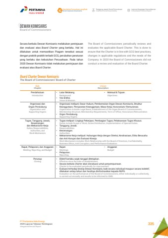 Tata Kelola Perusahaan yang BaikGood Corporate GovernanceTanggung Jawab Sosial PerusahaanCorporate Social ResponsibilityLaporan Keuangan KonsolidasianConsolidated Financial ReportPT Pertamina Hulu Energi2020 Laporan Tahunan TerintegrasiIntegrated Annual Report 335Dewan komisarisBoard of CommissionersThe Board of Commissioners periodically reviews and evaluates the applicable Board Charter. This is done to ensure that the Charter is in line with GCG best practices, changes in applicable regulations and the needs of the Company. In 2020 the Board of Commissioners did not conduct a review and evaluation of the Board Charter.Secara berkala Dewan Komisaris melakukan peninjauan dan evaluasi atas Board Charter yang berlaku. Hal ini dilakukan untuk memastikan Piagam tersebut sesuai dengan praktik-praktik terbaik GCG, perubahan peraturan yang berlaku dan kebutuhan Perusahaan. Pada tahun 2020 Dewan Komisaris tidak melakukan peninjauan dan evaluasi atas Board Charter.BabChapterUraianDescriptionPendahuluanIntroduction%u2022 Latar Belakang.Background.%u2022 Visi & Misi.Vision & Mission.%u2022 Maksud & Tujuan.Objectives.Organisasi dan Organ PendukungOrganization and Supporting Organs%u2022 Organisasi meliputi; Dasar Hukum, Pembentukan Organ Dewan Komisaris, Struktur Keanggotaan, Persyaratan Keanggotaan, Masa Kerja, Honorarium/ Remunerasi.Organization includes Legal Basis, Establishment of the Organ Board of Commissioners, Membership Structure, Membership Requirements, Term of Office, Honorarium/Remuneration.%u2022 Organ Pendukung.Supporting Organs.Tugas, Tanggung Jawab, Kewenangandan Mekanisme KerjaDuties, Responsibilities, Authorities, andWork Mechanism%u2022 Tugas meliputi: Lingkup Pekerjaan, Pembagian Tugas, Pelaksanaan Tugas Khusus. Duties include Scope of Work, Duties Distribution, Implementation of Special Duties. %u2022 Tanggung Jawab.Responsibilities.%u2022 Kewenangan.Authorities.%u2022 Mekanisme Kerja meliputi: Hubungan Kerja dengan Direksi, Kerahasiaan, Etika Berusaha dan Anti Korupsi dan Evaluasi Kinerja.Work Mechanism includes Work Relationship with the Board of Directors, Confidentiality, Business Ethics, Anti Corruption, and Performance Evaluation.Rapat, Pelaporan, dan AnggaranMeeting, Reporting, and Budget%u2022 Rapat.Meetings. %u2022 Pelaporan.Reporting.%u2022 AnggaranBudgetPenutupClosing%u2022 Efektif berlaku sejak tanggal ditetapkan. Effective since the date of establishment. %u2022 Secara berkala Charter akan dievaluasi untuk penyempurnaan. Charter to be evaluated periodically for improvement. %u2022 Evaluasi terhadap kinerja Dewan Komisaris, baik secara individual maupun secara kolektif, dilakukan setiap tahun dan hasilnya diinformasikan kepada RUPS.Evaluation on the performance of the Board of Commissioners, either individually or collectively, is carried out annually and results to be informed to GMS.Board Charter Dewan Komisaris The Board of Commissioners%u2019 Board of Charter