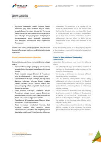 Tata Kelola Perusahaan yang BaikGood Corporate GovernanceTanggung Jawab Sosial PerusahaanCorporate Social ResponsibilityLaporan Keuangan KonsolidasianConsolidated Financial ReportPT Pertamina Hulu Energi2020 Laporan Tahunan TerintegrasiIntegrated Annual Report 337Dewan komisarisBoard of Commissioners%u2022 Independent Commissioner is a member of the Board of Commissioners who is not affiliated with the Board of Directors, other members of the Board of Commissioners and controlling shareholders, and is free from business relationships or other relationships that can affect his ability to act independently or act solely in the interests of the Company. During the reporting period, all of the Company%u2019s Boards of Commissioners have met the criteria for Independent Commissioners.Criteria for Determination of Independent CommissionerIndependent Commissioner must meet the following criteria:%u2022 Not affiliated with major shareholders, members of the Board of Directors and/or other members of the Board of Commissioners.%u2022 Not serving as a Director in a company affiliated with PT Pertamina Hulu Energi.%u2022 Has no financial, management and/or family relationship with other members of the Board of Commissioners, members of the Board of Directors and/or holders, controlling shares or relationship with the company.%u2022 Has no contractual relationship with the Company as a former member of the Board of Directors and a member of the Board of Commissioners and Workers of the Company in the past 3 (three) years.%u2022 Not working for the Company or its affiliates within the last 3 (three) years.%u2022 Has no financial interest, either directly or indirectly with the Company or other companies that provide goods and services to the Company and its affiliates.%u2022 Komisaris Independen adalah anggota Dewan Komisaris yang tidak terafiliasi dengan Direksi, anggota Dewan Komisaris lainnya dan Pemegang Saham pengendali, serta bebas dari hubungan bisnis atau hubungan lainnya yang dapat mempengaruhi kemampuannya untuk bertindak independen atau bertindak semata-mata demi kepentingan Perusahaan.Selama kurun waktu periode pelaporan, seluruh Dewan Komisaris Perseroan telah memenuhi kriteria Komisaris Independen.Kriteria Penentuan Komisaris IndependenKomisaris Independen harus memenuhi kriteria, sebagai berikut:%u2022 Tidak terafiliasi dengan pemegang saham utama, anggota Direksi dan/atau anggota Dewan Komisaris lainnya. %u2022 Tidak menjabat sebagai Direktur di Perusahaan yang terafiliasi dengan PT Pertamina Hulu Energi. %u2022 Tidak memiliki hubungan keuangan, kepengurusan, dan/atau hubungan keluarga dengan anggota Dewan Komisaris lainnya, anggota Direksi dan/atau pemegang, saham pengendali atau hubungan dengan perusahaan. %u2022 Tidak memiliki hubungan kontraktual dengan Perusahaan sebagai mantan anggota Direksi dan anggota Dewan Komisaris serta Pekerja Perusahaan dalam kurun waktu 3 (tiga) tahun terakhir. %u2022 Tidak bekerja di Perusahaan atau afiliasinya dalam kurun waktu 3 (tiga) tahun terakhir. %u2022 Tidak mempunyai ketertarikan finansial, baik langsung maupun tidak langsung dengan Perusahaan atau perusahaan lain yang menyediakan barang dan jasa kepada Perusahaan dan afiliasinya.