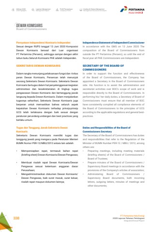 Laporan ManajemenManagement ReportProfil PerusahaanCompany ProfileAnalisa & Diskusi ManajemenManagement Discussion & AnalysisIkhtisar 20202020 HighlightsPT Pertamina Hulu Energi2020 Laporan Tahunan TerintegrasiIntegrated Annual Report 338Dewan komisarisBoard of CommissionersIndependence Statement of Independent Commissioner In accordance with the GMS on 13 June 2020 The composition of the Board of Commissioners from outside the PT Pertamina (Persero), so until the end of fiscal year all PHE Commissioners are Independent.SECRETARY OF THE BOARD OF COMMISSIONERSIn order to support the function and effectiveness of the Board of Commissioners, the Company has appointed a Secretary in the Board of Commissioners side. His function is to assist the administration and secretariat activities over BOC%u2019s scope of work and is responsible directly to the Board of Commissioners. In performing his/ her daily duties, a Secretary of Board of Commissioners must ensure that all member of BOC have consistently compiled all compliance elements of the Board of Commissioners to the principles of GCG according to the applicable regulations and general bestpractices.Duties and Responsibilities of the Board of Commissioners SecretaryThe Secretary of the Board of Commissioners has duties and responsibilities that refer to the Regulation of the Minister of BUMN Number PER-12 / MBU / 2012, among others are:%u2022 Preparing meetings, including meeting materials (briefing sheets) of the Board of Commissioners / Board of Trustees;%u2022 Prepare minutes of the Board of Commissioners / Supervisory Board meetings in accordance with the provisions of the Company%u2019s articles of association;%u2022 Administering Board of Commissioners / Supervisory Board documents, both incoming letters, outgoing letters, minutes of meetings and other documents;Pernyataan Independensi Komisaris IndependenSesuai dengan RUPS tanggal 13 Juni 2020 Komposisi Dewan Komisaris berasal dari Luar organisasi PT Pertamina (Persero), sehingga sampai dengan akhir tahun buku Seluruh Komisaris PHE adalah Independen.SEKRETARIS DEWAN KOMISARISDalam rangka menunjang pelaksanaan fungsi dan tivitas peran Dewan Komisaris, Perseroan telah menunjuk seorang Sekretaris Dewan Komisaris. Sekretaris Dewan Komisaris bertugas dalam hal penyelenggaraan kegiatan administrasi dan kesekretariatan di lingkup tugas pengawasan Dewan Komisaris dan bertanggung jawab langsung kepada Dewan Komisaris. Dalam menjalankan tugasnya seharihari, Sekretaris Dewan Komisaris juga berperan untuk memastikan bahwa seluruh aspek kepatuhan Dewan Komisaris terhadap prinsip-prinsip GCG telah terlaksana dengan baik sesuai dengan peraturan perundang-undangan dan best practices yang berlaku umum. Tugas dan Tanggung Jawab Sekretaris Dewan KomisarisSekretaris Dewan Komisaris memiliki tugas dan tanggung jawab yang mengacu pada Peraturan Menteri BUMN Nomor PER-12/MBU/2012 antara lain adalah:%u2022 Mempersiapkan rapat, termasuk bahan rapat (briefing sheet) Dewan Komisaris/Dewan Pengawas;%u2022 Membuat risalah rapat Dewan Komisaris/Dewan Pengawas sesuai ketentuan anggaran dasar Perusahaan; %u2022 Mengadministrasikan dokumen Dewan Komisaris/Dewan Pengawas, baik surat masuk, surat keluar, risalah rapat maupun dokumen lainnya;