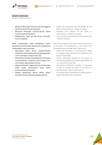 Tata Kelola Perusahaan yang BaikGood Corporate GovernanceTanggung Jawab Sosial PerusahaanCorporate Social ResponsibilityLaporan Keuangan KonsolidasianConsolidated Financial ReportPT Pertamina Hulu Energi2020 Laporan Tahunan TerintegrasiIntegrated Annual Report 339%u2022 Prepare the Draft Work Plan and Budget for the Board of Commissioners / Board of Trustees;%u2022 Preparing Draft Reports for the Board of Commissioners / Board of Trustees;%u2022 Carry out other duties of the Board of Commissioners / Board of Trustees.Apart from carrying out the above tasks, the Secretary of the Board of Commissioners as the head of the Secretariat carries out other tasks in the form of:%u2022 Ensure that the Board of Commissioners / Board of Trustees comply with laws and regulations and apply GCG principles;%u2022 Provide information required by the Board of Commissioners/Supervisory Board periodically and / or at any time if requested;%u2022 Coordinating Committee members, if necessary in order to expedite the duties of the Board of Commissioners / Board of Supervisors;%u2022 As a liaison officer for the Board of Commissioners/Supervisory Board with other parties.%u2022 Menyusun Rancangan Rencana Kerja dan Anggaran Dewan Komisaris/Dewan Pengawas; %u2022 Menyusun Rancangan Laporan-Laporan Dewan Komisaris/Dewan Pengawas; %u2022 Melaksanakan tugas lain dari Dewan Komisaris/Dewan Pengawas.Selain melaksanakan tugas sebagaimana diatas, Sekretaris Dewan Komisaris selaku pimpinan Sekretariat, melaksanakan tugas lain berupa:%u2022 Memastikan bahwa Dewan Komisaris/Dewan Pengawas mematuhi peraturan perundangundangan serta menerapkan prinsip-prinsip GCG; %u2022 Memberikan informasi yang dibutuhkan oleh Dewan Komisaris/Dewan Pengawas secara berkala dan/atau sewaktu-waktu apabila diminta; %u2022 Mengkoordinasikan anggota Komite, jika diperlukan dalam rangka memperlancar tugas Dewan Komisaris/Dewan Pengawas; %u2022 Sebagai penghubung (liaison officer) Dewan Komisaris/Dewan Pengawas dengan pihak lain.Dewan komisarisBoard of Commissioners