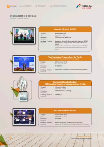 Indonesian CSR Awards (ICA) 2020%u201cGreat Practice Award%u201d dalam kategori Best PracticeGreat Practice Award, Best Practice CategoryTanggal :DateTanggal :DatePenerima :RecipientPenerima :RecipientLembaga Pemberi :OrganizerLembaga Pemberi :Organizer6 November 2020November 6 202028 November 2020November 28, 2020PT Pertamina Hulu EnergiPHE WMOCorporate Forum for Community Development (CFCD) bekerjasama dengan Badan Standarisasi Nasional (BSN)Corporate Forum for Community Development (CFCD) in collaboration with the National Standardization Agency (BSN)Alliance for Sustainable Development Goals (ASDGs)BPPT Innovator Awards (BIA) 2020Tanggal :DatePenerima :RecipientLembaga Pemberi :Organizer10 Desember 2020December 10, 2020PHE ONWJ Badan Pengkajian dan Penerapan TeknologiAgency for the Assessment and Application of TechnologyPenghargaan & SertifikasiAwards & CertificationsAssurance and Consulting Excellence 2020 International Covention on Indonesian Upstream Oil & Gas Tanggal :DatePenerima :RecipientLembaga Pemberi :Organizer4 Desember 2020December 4, 2020PT Pertamina Hulu EnergiSKK MigasLaporan ManajemenManagement ReportProfil PerusahaanCompany ProfileAnalisa & Diskusi ManajemenManagement Discussion & AnalysisIkhtisar 20202020 HighlightsPT Pertamina Hulu Energi2020 Laporan Tahunan TerintegrasiIntegrated Annual Report 34