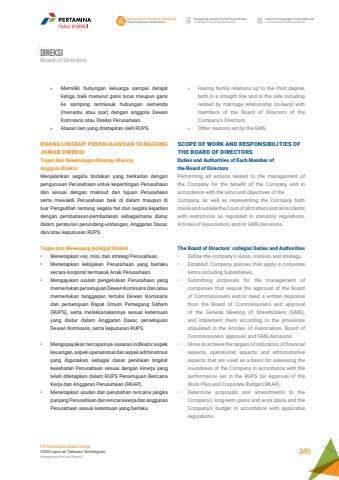 Tata Kelola Perusahaan yang BaikGood Corporate GovernanceTanggung Jawab Sosial PerusahaanCorporate Social ResponsibilityLaporan Keuangan KonsolidasianConsolidated Financial ReportPT Pertamina Hulu Energi2020 Laporan Tahunan TerintegrasiIntegrated Annual Report 345DireksiBoard of Directors%u00bb Having family relations up to the third degree, both in a straight line and to the side including related by marriage relationship (in-laws) with members of the Board of Directors of the Company%u2019s Directors.%u00bb Other reasons set by the GMS.SCOPE OF WORK AND RESPONSIBILITIES OF THE BOARD OF DIRECTORSDuties and Authorities of Each Member of the Board of DirectorsPerforming all actions related to the management of the Company for the benefit of the Company and in accordance with the aims and objectives of theCompany, as well as representing the Company both inside and outside the Court of all matters and all incidents with restrictions as regulated in statutory regulations, Articles of Association, and/or GMS decisions.The Board of Directors%u2019 collegial Duties and Authorities%u2022 Define the company%u2019s vision, mission and strategy.%u2022 Establish Company policies that apply in corporate terms including Subsidiaries.%u2022 Submitting proposals for the management of companies that require the approval of the Board of Commissioners and/or need a written response from the Board of Commissioners and approval of the General Meeting of Shareholders (GMS), and implement them according to the provisions stipulated in the Articles of Association, Board of Commissioners%u2019 approval, and GMS decisions.%u2022 Strive to achieve the targets of indicators of financial aspects, operational aspects and administrative aspects that are used as a basis for assessing the soundness of the Company in accordance with the performance set in the RUPS for Approval of the Work Plan and Corporate Budget (RKAP).%u2022 Determine proposals and amendments to the Company%u2019s long-term plans and work plans and the Company%u2019s budget in accordance with applicable regulations.%u00bb Memiliki hubungan keluarga sampai derajat ketiga, baik menurut garis lurus maupun garis ke samping termasuk hubungan semenda (menantu atau ipar) dengan anggota Dewan Komisaris atau Direksi Perusahaan.%u00bb Alasan lain yang ditetapkan oleh RUPS.RUANG LINGKUP PEKERJAAN DAN TANGGUNGJAWAB DIREKSITugas dan Kewenangan Masing-Masing Anggota DireksiMenjalankan segala tindakan yang berkaitan dengan pengurusan Perusahaan untuk kepentingan Perusahaan dan sesuai dengan maksud dan tujuan Perusahaan serta mewakili Perusahaan baik di dalam maupun di luar Pengadilan tentang segala hal dan segala kejadian dengan pembatasan-pembatasan sebagaimana diatur dalam peraturan perundang-undangan, Anggaran Dasar, dan/atau keputusan RUPS.Tugas dan Wewenang Kolegial Direksi%u2022 Menetapkan visi, misi, dan strategi Perusahaan. %u2022 Menetapkan kebijakan Perusahaan yang berlaku secara korporat termasuk Anak Perusahaan. %u2022 Mengajukan usulan pengelolaan Perusahaan yang memerlukan persetujuan Dewan Komisaris dan/atau memerlukan tanggapan tertulis Dewan Komisaris dan persetujuan Rapat Umum Pemegang Saham (RUPS), serta melaksanakannya sesuai ketentuan yang diatur dalam Anggaran Dasar, persetujuan Dewan Komisaris, serta keputusan RUPS. %u2022 Mengupayakan tercapainya sasaran indikator aspek keuangan, aspek operasional dan aspek administrasi yang digunakan sebagai dasar penilaian tingkat kesehatan Perusahaan sesuai dengan kinerja yang telah ditetapkan dalam RUPS Persetujuan Rencana Kerja dan Anggaran Perusahaan (RKAP). %u2022 Menetapkan usulan dan perubahan rencana jangka panjang Perusahaan dan rencana kerja dan anggaran Perusahaan sesuai ketentuan yang berlaku.