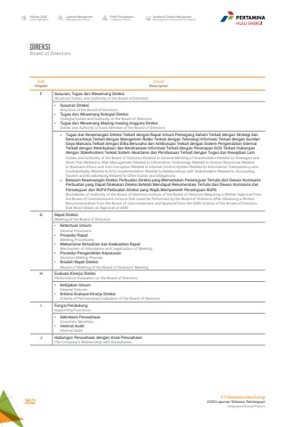 Laporan ManajemenManagement ReportProfil PerusahaanCompany ProfileAnalisa & Diskusi ManajemenManagement Discussion & AnalysisIkhtisar 20202020 HighlightsPT Pertamina Hulu Energi2020 Laporan Tahunan TerintegrasiIntegrated Annual Report 352BabChapterUraianDescriptionF Susunan, Tugas dan Wewenang DireksiStructure, Duties, and Authority of the Board of Directors%u2022 Susunan DireksiStructure of the Board of Directors%u2022 Tugas dan Wewenang Kolegial DireksiCollegial Duties and Authority of the Board of Directors%u2022 Tugas dan Wewenang Masing-masing Anggota DireksiDuties and Authority of Each Member of the Board of Directors%u00bb Tugas dan Kewenangan Direksi Terkait dengan Rapat Umum Pemegang Saham Terkait dengan Strategi dan Rencana Kerja Terkait dengan Manajemen Risiko Terkait dengan Teknologi Informasi Terkait dengan Sumber Daya Manusia Terkait dengan Etika Berusaha dan Antikorupsi Terkait dengan Sistem Pengendalian Internal Terkait dengan Keterbukaan dan Kerahasiaan Informasi Terkait dengan Penerapan GCG Terkait Hubungan dengan Stakeholders Terkait Sistem Akuntansi dan Pembukuan Terkait dengan Tugas dan Kewajiban LainDuties and Authority of the Board of Directors Related to General Meeting of Shareholders Related to Strategies and Work Plan Related to Risk Management Related to Information Technology Related to Human Resources Related to Business Ethics and Anti Corruption Related to Internal Control System Related to Information Transparency and Confidentiality Related to GCG implementation Related to Relationships with Stakeholders Related to Accounting System and Bookkeeping Related to Other Duties and Obligations%u00bb Batasan Kewenangan Direksi Perbuatan Direksi yang Memerlukan Persetujuan Tertulis dari Dewan Komisaris Perbuatan yang Dapat Dilakukan Direksi Setelah Mendapat Rekomendasi Tertulis dari Dewan Komisaris dan Persetujuan dari RUPS Perbuatan Direksi yang Wajib Memperoleh Persetujuan RUPSBoundaries of Authority of the Board of Directors Actions of the Board of Directors Requiring a Written Approval from the Board of Commissioners Actions that could be Performed by the Board of Directors After Obtaining a Written Recommendation from the Board of Commissioners and Approval from the GMS Actions of the Board of Directors that Must Obtain an Approval of GMSG Rapat DireksiMeeting of the Board of Directors%u2022 Ketentuan UmumGeneral Provisions%u2022 Prosedur RapatMeeting Procedures%u2022 Mekanisme Kehadiran dan Keabsahan RapatMechanism of Attendance and Legalization of Meeting%u2022 Prosedur Pengambilan KeputusanDecision-Making Process%u2022 Risalah Rapat DireksiMinute of Meeting of the Board of Directors%u2019 MeetingH Evaluasi Kinerja DireksiPerformance Evaluation on the Board of Directors%u2022 Kebijakan UmumGeneral Policies%u2022 Kriteria Evaluasi Kinerja DireksiCriteria of Performance Evaluation of the Board of DirectorsI Fungsi PendukungSupporting Functions%u2022 Sekretaris PerusahaanCorporate Secretary%u2022 Internal AuditInternal AuditJ Hubungan Perusahaan dengan Anak PerusahaanThe Company%u2019s Relationship with SubsidiariesDireksiBoard of Directors