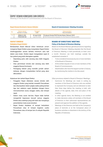 RAPAT DEWAN KOMISARIS DAN DIREKSIMeeting of the Board of Commissioners and the Board of DirectorsLaporan ManajemenManagement ReportProfil PerusahaanCompany ProfileAnalisa & Diskusi ManajemenManagement Discussion & AnalysisIkhtisar 20202020 HighlightsPT Pertamina Hulu Energi2020 Laporan Tahunan TerintegrasiIntegrated Annual Report 356Rapat Dewan Komisaris Secara SirkulerNo Nomor SuratNumber of LetterTanggalDateRekomendasiRecomendation1 RRDK-01/DKPHE/2020-S020 April 2020April 20, 2020Evaluasi Kinerja PHE Periode Bulan Februari 2020PHE Performance Evaluation for the Period of February 2020RAPAT DIREKSI Kebijakan Rapat Direksi Berdasarkan Board Manual diatur ketentuan umum mengenai Rapat Direksi yang menyatakan Rapat Direksi diselenggarakan secara berkala minimum satu kali dalam satu bulan. Direksi dapat mengadakan rapat di luar jadwal yang telah ditetapkan apabila: %u2022 Dipandang perlu oleh seorang atau lebih Anggota Direksi;%u2022 Atas permintaan tertulis dari seorang atau lebih anggota Dewan Komisaris; %u2022 Pemegang Saham yang memiliki jumlah saham terbesar, dengan menyebutkan hal-hal yang akan dibicarakan. Ketentuan lain terkait Rapat Direksi:%u2022 Panggilan Rapat dilakukan secara tertulis oleh anggota Direksi yang berhak mewakili Perusahaan dan disampaikan dalam jangka waktu paling lambat tiga hari sebelum rapat diadakan dengan harus mencantumkan acara, tanggal, waktu, dan tempat rapat. %u2022 Dalam mata acara lain-lain, Rapat tidak berhak mengambil keputusan kecuali semua anggota Direksi atau wakilnya yang sah hadir dan menyetujui penambahan mata acara tersebut. %u2022 Rapat Direksi diadakan di tempat kedudukan Perusahaan atau di tempat kegiatan usaha Perusahaan atau di tempat lain di wilayah Republik Indonesia. Board of Commissioners%u2019 Meeting CircularlyBOARD OF DIRECTORS%u2019 MEETINGPolicy of the Board of Directors MeetingBased on the Board Manual, general provisions regarding the Board of Directors%u2019 Meeting stipulate that the Board of Directors Meeting is held periodically at least once a month. Directors can hold meetings outside the established schedule if:%u2022 To be considered necessary by one or more members of the Board of Directors;%u2022 At the written request of one or more members of the Board of Commissioners;%u2022 Shareholders who have the largest number of shares, by mentioning the matters to be discussed.Other provisions related to Board of Directors%u2019 Meetings:%u2022 Summons for Meetings are made in writing by members of the Board of Directors who are entitled to represent the Company and are delivered no later than three days before the meeting is held, with details of the agenda, date, time and place of the meeting.%u2022 In other agenda items, the Meeting is not entitled to make decisions unless all members of the Board of Directors or their authorized representatives are present and approve the addition of the agenda.%u2022 Meetings of the Directors are held at the Company%u2019s place of domicile or at the Company%u2019s place of business activities or elsewhere in the territory of the Republic of Indonesia.