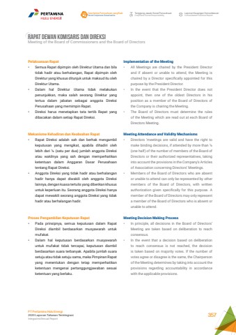 RAPAT DEWAN KOMISARIS DAN DIREKSIMeeting of the Board of Commissioners and the Board of DirectorsTata Kelola Perusahaan yang BaikGood Corporate GovernanceTanggung Jawab Sosial PerusahaanCorporate Social ResponsibilityLaporan Keuangan KonsolidasianConsolidated Financial ReportPT Pertamina Hulu Energi2020 Laporan Tahunan TerintegrasiIntegrated Annual Report 357Pelaksanaan Rapat %u2022 Semua Rapat dipimpin oleh Direktur Utama dan bila tidak hadir atau berhalangan, Rapat dipimpin oleh Direktur yang khusus ditunjuk untuk maksud itu oleh Direktur Utama.%u2022 Dalam hal Direktur Utama tidak melakukan penunjukkan, maka salah seorang Direktur yang tertua dalam jabatan sebagai anggota Direksi Perusahaan yang memimpin Rapat. %u2022 Direksi harus menetapkan tata tertib Rapat yang dibacakan dalam setiap Rapat Direksi. Mekanisme Kehadiran dan Keabsahan Rapat %u2022 Rapat Direksi adalah sah dan berhak mengambil keputusan yang mengikat, apabila dihadiri oleh lebih dari %u00bd (satu per dua) jumlah anggota Direksi atau wakilnya yang sah dengan memperhatikan ketentuan dalam Anggaran Dasar Perusahaan tentang Rapat Direksi. %u2022 Anggota Direksi yang tidak hadir atau berhalangan hadir hanya dapat diwakili oleh anggota Direksi lainnya, dengan kuasa tertulis yang diberikan khusus untuk keperluan itu. Seorang anggota Direksi hanya dapat mewakili seorang anggota Direksi yang tidak hadir atau berhalangan hadir. Proses Pengambilan Keputusan Rapat %u2022 Pada prinsipnya, semua keputusan dalam Rapat Direksi diambil berdasarkan musyawarah untuk mufakat. %u2022 Dalam hal keputusan berdasarkan musyawarah untuk mufakat tidak tercapai, keputusan diambil berdasarkan suara terbanyak. Apabila jumlah suara setuju atau tidak setuju sama, maka Pimpinan Rapat yang menentukan dengan tetap memperhatikan ketentuan mengenai pertanggungjawaban sesuai ketentuan yang berlaku.Implementation of the Meeting%u2022 All Meetings are chaired by the President Director and if absent or unable to attend, the Meeting is chaired by a Director specifically appointed for this purpose by the President Director.%u2022 In the event that the President Director does not appoint, then one of the oldest Directors in his position as a member of the Board of Directors of the Company is chairing the Meeting.%u2022 The Board of Directors must determine the rules of the Meeting which are read out at each Board of Directors Meeting.Meeting Attendance and Validity Mechanisms%u2022 Directors %u2018meetings are valid and have the right to make binding decisions, if attended by more than %u00bd (one half) of the number of members of the Board of Directors or their authorized representatives, taking into account the provisions in the Company%u2019s Articles of Association concerning Directors%u2019 Meetings.%u2022 Members of the Board of Directors who are absent or unable to attend can only be represented by other members of the Board of Directors, with written authorization given specifically for this purpose. A member of the Board of Directors may only represent a member of the Board of Directors who is absent or unable to attend.Meeting Decision Making Process%u2022 In principle, all decisions in the Board of Directors%u2019 Meeting are taken based on deliberation to reach consensus.%u2022 In the event that a decision based on deliberation to reach consensus is not reached, the decision is taken based on majority votes. If the number of votes agree or disagree is the same, the Chairperson of the Meeting determines by taking into account the provisions regarding accountability in accordance with the applicable provisions.