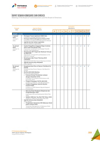 RAPAT DEWAN KOMISARIS DAN DIREKSIMeeting of the Board of Commissioners and the Board of DirectorsTata Kelola Perusahaan yang BaikGood Corporate GovernanceTanggung Jawab Sosial PerusahaanCorporate Social ResponsibilityLaporan Keuangan KonsolidasianConsolidated Financial ReportPT Pertamina Hulu Energi2020 Laporan Tahunan TerintegrasiIntegrated Annual Report 359TanggalDateAgenda RapatMeeting Agenda KehadiranAttendanceBP JHS TA MK LE HMZ M AM AS SRPJanuari | January7 Januari 2020January 7, 2020%u2022 Persiapan Forum Upstream HSSE Hulu.Preparation of HSSE Upstream Forum.%u2022 Persiapan BOD & Management Retreat PHE.Preparation for BOD & PHE Management Retreat.%u2022 Agenda lain-lain terkait organisasi.Agenda related to organization.- - %u221a - - - %u221a %u221a X %u221a14 Januari 2020January 14, 2020%u2022 Usulan Pengalihan Anggaran Biaya Investasi antar Anak Perusahaan PHE.Proposal of Investment Cost Budget Transfer between PHE Subsidiaries.%u2022 Penyesuaian KPI Target dan Realisasi Temuan 2C BOB CPP.Adjustment of Target KPI and Realization of 2C BOB CPP Findings.%u2022 Persetujuan Man Power Planning 2020 (Terbatas).Approval of 2020 Man Power Planning (Limited).%u2022 Agenda lainnya yang disepakati.Other Agenda.- - %u221a - - - %u221a %u221a %u221a %u221a24 Januari 2020January 24, 2020%u2022 Exceptional Gas Price of Senoro Toili Block for DSLNG.Exceptional Gas Price of Senoro Toili Block for DSLNG.%u2022 Dry Run BOC-BOD Meeting.Dry Run BOC-BOD Meeting.%u00bb Evaluasi Kinerja Perusahaan sampai dengan Desember 2019.Evaluation of Company Performance until December 2019.%u00bb Progres Penyiapan FS/FIS ABI 2020.Progress of 2020 FS / FIS ABI Preparation.%u00bb Progres Pengadaan Seismik Rig dan Fasprod 2020.Progress of 2020 Seismic Rig and Fasprod Procurement.- - %u221a - - - %u221a %u221a %u221a %u221a%u00bb Rencana Kerja Pemboran Eksplorasi dan Pengembangan 2020Exploration Drill and Development Work Plan 2020.%u00bb Update AIMS dan Top Risk PHE Tahun 2020.Update on AIMS and Top Risk PHE 2020.%u2022 Agenda lainnya yang disepakati:Other Agenda :%u00bb Pengelolaan Sementara WK Makassar Strait pasca Januari 2020.Temporary Management of Makassar Strait working area post January 2020.