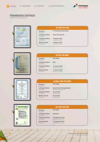 Penghargaan & SertifikasiAwards & CertificationsISO 9001 (PHE ONWJ)Sertifikasi SMK3 (PHE ONWJ)ISO 14001 (PHE OSES)Penerima :RecipientPenerima :RecipientPenerima :RecipientLembaga Pemberi :OrganizerLembaga Pemberi :OrganizerLembaga Pemberi :OrganizerTanggal Perolehan :Issue DateTanggal Perolehan :Issue DateTanggal Perolehan :Issue DateBerlaku Sampai :Valid UntilBerlaku Sampai :Valid UntilBerlaku Sampai :Valid UntilPHE ONWJPHE ONWJPHE OSESNQAKementerian KetenagakerjaanMinistry of ManpowerSucofindo12 Januari 2018January 12, 201830 Juli 2018July 30, 201818 September 2018September 18, 201812 Januari 2020January 12, 202030 Juli 2021July 30, 202117 September 2021September 17, 2018ISO 37001:2016 (PHE)Penerima :RecipientLembaga Pemberi :OrganizerTanggal Perolehan :Issue DateBerlaku Sampai :Valid UntilPT Pertamina Hulu EnergiMutu Internasional9 Oktober 2020October 9, 20209 Oktober 2023October 9, 2023Laporan ManajemenManagement ReportProfil PerusahaanCompany ProfileAnalisa & Diskusi ManajemenManagement Discussion & AnalysisIkhtisar 20202020 HighlightsPT Pertamina Hulu Energi2020 Laporan Tahunan TerintegrasiIntegrated Annual Report 36