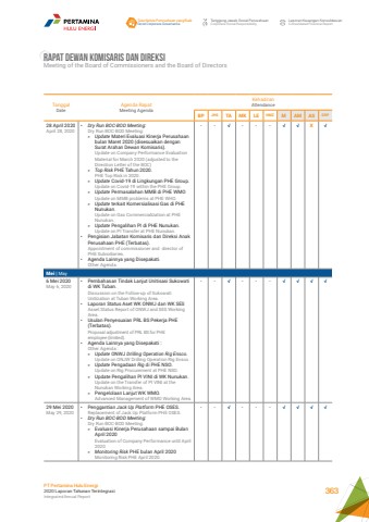 RAPAT DEWAN KOMISARIS DAN DIREKSIMeeting of the Board of Commissioners and the Board of DirectorsTata Kelola Perusahaan yang BaikGood Corporate GovernanceTanggung Jawab Sosial PerusahaanCorporate Social ResponsibilityLaporan Keuangan KonsolidasianConsolidated Financial ReportPT Pertamina Hulu Energi2020 Laporan Tahunan TerintegrasiIntegrated Annual Report 363TanggalDateAgenda RapatMeeting Agenda KehadiranAttendanceBP JHS TA MK LE HMZ M AM AS SRP28 April 2020April 28, 2020%u2022 Dry Run BOC-BOD Meeting:Dry Run BOC-BOD Meeting:%u00bb Update Materi Evaluasi Kinerja Perusahaan bulan Maret 2020 (disesuaikan dengan Surat Arahan Dewan Komisaris).Update on Company Performance Evaluation Material for March 2020 (adjusted to the Direction Letter of the BOC)%u00bb Top Risk PHE Tahun 2020.PHE Top Risk in 2020.%u00bb Update Covid-19 di Lingkungan PHE Group.Update on Covid-19 within the PHE Group.%u00bb Update Permasalahan MMB di PHE WMOUpdate on MMB problems at PHE WHO.%u00bb Update terkait Komersialisasi Gas di PHE Nunukan.Update on Gas Commercialization at PHE Nunukan.%u00bb Update Pengalihan PI di PHE Nunukan.Update on PI Transfer at PHE Nunukan.%u2022 Pengisian Jabatan Komisaris dan Direksi Anak Perusahaan PHE (Terbatas).Appointment of commissioner and director of PHE Subsidiaries.%u2022 Agenda Lainnya yang Disepakati.Other Agenda.- - %u221a - - - %u221a %u221a X %u221aMei | May6 Mei 2020May 6, 2020%u2022 Pembahasan Tindak Lanjut Unitisasi Sukowati di WK Tuban.Discussion on the Follow-up of Sukowati Unitization at Tuban Working Area.%u2022 Laporan Status Aset WK ONWJ dan WK SESAsset Status Report of ONWJ and SES Working Area. %u2022 Usulan Penyesuaian PRL BS Pekerja PHE (Terbatas).Proposal adjustment of PRL BS for PHE employee (limited).%u2022 Agenda Lainnya yang Disepakati :Other Agenda :%u00bb Update ONWJ Drilling Operation Rig Ensco.Update on ONJW Drilling Operation Rig Ensco.%u00bb Update Pengadaan Rig di PHE NSO.Update on Rig Procurement at PHE NSO.%u00bb Update Pengalihan PI VINI di WK Nunukan.Update on the Transfer of PI VINI at the Nunukan Working Area.%u00bb Pengelolaan Lanjut WK WMO.Advanced Management of WMO Working Area.- - %u221a - - - %u221a %u221a %u221a %u221a29 Mei 2020May 29, 2020%u2022 Penggantian Jack Up Platform PHE OSES.Replacement of Jack Up Platform PHE OSES.%u2022 Dry Run BOC-BOD Meeting:Dry Run BOC-BOD Meeting:%u00bb Evaluasi Kinerja Perusahaan sampai Bulan April 2020Evaluation of Company Performance until April 2020%u00bb Monitoring Risk PHE bulan April 2020Monitoring Risk PHE April 2020.- - %u221a - - - %u221a %u221a %u221a %u221a