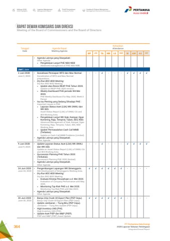 RAPAT DEWAN KOMISARIS DAN DIREKSIMeeting of the Board of Commissioners and the Board of DirectorsLaporan ManajemenManagement ReportProfil PerusahaanCompany ProfileAnalisa & Diskusi ManajemenManagement Discussion & AnalysisIkhtisar 20202020 HighlightsPT Pertamina Hulu Energi2020 Laporan Tahunan TerintegrasiIntegrated Annual Report 364TanggalDateAgenda RapatMeeting Agenda KehadiranAttendanceBP JHS TA MK LE HMZ M AM AS SRP%u2022 Agenda Lainnya yang Disepakati :Other Agenda :%u00bb Pengelolaan Lanjut PHE NSO-NSBAdvanced management of PHE NSO-NSB.Juni | June2 Juni 2020June 2, 2020%u2022 Sosialisasi Persiapan WFO dan New Normal.Socialization of WFO and New Normal preparations.%u2022 Dry Run BOC-BOD Meeting:Dry Run BOC-BOD Meeting:%u00bb Update atas Revisi RKAP PHE Tahun 2020.Update on RKSP PHE 2020 revision.%u00bb Weekly Dashboard PHE periode W4 Mei 2020.PHE Weekly Dashboard for May 2020, Week 4 Period.%u2022 Isu-isu Penting yang Sedang Dihadapi PHE :Important issues in PHE :%u00bb Laporan Status Aset (LSA) WK ONWJ dan WK SES.Asset Status Report (LSA) of ONWJ CA and SES Working Area.%u00bb Pengelolaan Lanjut WK Siak, Kampar, Ogan Komering, Raja, Tempirai, Tuban, SES, NSO.Advanced Management of Siak, Kampar, Ogan Komering, Raja, Tempirai, Tuban, SES, NSO Working Area.%u00bb Update Permasalahan Cash Call MMB (Terbatas).Update on Cash Call MMB Problems (Limited).%u2022 Agenda Lainnya yang Disepakati.Other Agenda.- - %u221a - - - %u221a %u221a %u221a %u221a9 Juni 2020June 9, 2020%u2022 Update Laporan Status Aset (LSA) WK ONWJ dan WK SES.Update on Asset Status Report (LSA) of ONWJ CA and SES Working Area.%u2022 Succession Planning PHE Tahun 2020 (Terbatas).Succession Planning PHE 2020 (limited).%u2022 Agenda Lainnya yang Disepakati.Other Agenda.- - %u221a - - - %u221a %u221a %u221a %u221a24 Juni 2020June 24, 2020%u2022 Pengembangan Lapangan WK Simenggaris.Site Development of Simenggaris Working Area. %u2022 Dry Run BOC-BOD Meeting:Dry Run BOC-BOD Meeting:%u00bb Evaluasi Kinerja Perusahaan s.d. Mei 2020.Evaluation of Company Performance until May 2020.%u00bb Monitoring Top Risk PHE s.d. Mei 2020.Monitoring Top Risk PHE until Mei 2020.%u2022 Agenda Lainnya yang Disepakati.Other Agenda%u221a %u221a %u221a %u221a %u221a %u221a - - - -30 Juni 2020June 30, 2020%u2022 Banyu Urip Crude Oil Export Plan (PEP Cepu).Banyu Urip Crude Oil Export Plan (PEP Cepu).%u2022 Update Jambaran %u2013 Tiung Biru (PEP Cepu).Jambaran %u2013 Tiung Biru Update (PEP Cepu).%u2022 High Inventory LNG (PHI).High Inventory LNG (PHI).%u2022 Update Aset PIEP dan M&P (PIEP).PIEP and M&P (PIEP) Asset Update.%u221a %u221a %u221a %u221a %u221a %u221a - - - -