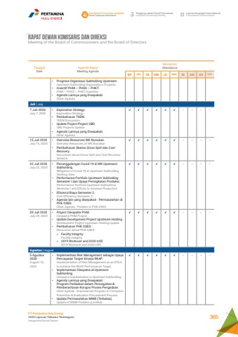 RAPAT DEWAN KOMISARIS DAN DIREKSIMeeting of the Board of Commissioners and the Board of DirectorsTata Kelola Perusahaan yang BaikGood Corporate GovernanceTanggung Jawab Sosial PerusahaanCorporate Social ResponsibilityLaporan Keuangan KonsolidasianConsolidated Financial ReportPT Pertamina Hulu Energi2020 Laporan Tahunan TerintegrasiIntegrated Annual Report 365TanggalDateAgenda RapatMeeting Agenda KehadiranAttendanceBP JHS TA MK LE HMZ M AM AS SRP%u2022 Progress Organisasi Subholding Upstream.Upstream Subholding Organization Progress.%u2022 Insentif PHM %u2013 PHSS %u2013 PHKT.PHM %u2013 PHSS %u2013 PHKT Insentive.%u2022 Agenda Lainnya yang Disepakati.Other Agenda.Juli | July7 Juli 2020July 7, 2020%u2022 Exploration Strategy.Exploration Strategy.%u2022 Pembahasan TKDN.TKDN Discussion.%u2022 Update Project-Project UBD.UBD Projects Update.%u2022 Agenda Lainnya yang Disepakati.Other Agenda.%u221a %u221a %u221a %u221a %u221a %u221a - - - -15 Juli 2020July 15, 2020%u2022 Overview Resources WK Nunukan.Overview Resources of WK Nunukan%u2022 Pembahasan Skema Gross Split dan Cost Recovery.Discussion about Gross Split and Cost Recovery Scheme.%u221a %u221a %u221a %u221a %u221a %u221a - - - -22 Juli 2020July 22, 2020%u2022 Penanggulangan Covid-19 di WK Upstream Subholding.Mitigation of Covid-19 at Upstream Subholding Working Area.%u2022 Performance Portfolio Upstream Subholding Semester I dan Upaya Peningkatan Produksi. Performance Portfolio Upstream Subholding Semester I and Efforts to Increase Production%u2022 Efisiensi Biaya Semester 2.Cost Efficiency Semester 2.%u2022 Agenda lain yang disepakati : Permasalahan di PHE OSES.Other Agenda : Problem in PHE OSES.%u221a %u221a %u221a %u221a %u221a %u221a - - - -29 Juli 2020July 29, 2020%u2022 Project Cleopatra PHM.Cleopatra PHM Project.%u2022 Update Development Project Upstream Holding Development Project Upstream Holding Update%u2022 Pembahasan PHE OSES :Discussion about PHE OSES :%u00bb Facility Integrity.Facility Integrity.%u00bb 2019 Workover and 2020 Infill.2019 Workover and 2020 Infill.%u221a %u221a %u221a %u221a %u221a %u221a - - - -Agustus | August5 Agustus 2020August 15, 2020%u2022 Implementasi Risk Management sebagai Upaya Pencapaian Target Kinerja RKAP.Implementation of Risk Management as an Effort to Achieve the RKAP Performance Target.%u2022 Implementasi Cleopatra di Upstream Subholding.Cleopatra Impelentation in Upstream Subholding.%u2022 Agenda Lainnya yang Disepakati : Program Perbaikan dalam Pencegahan & Pemberantasan Korupsi Proses Pengadaan.Other Agenda : Improvement Program in Corruption Prevention & Eradication Procurement Process.%u2022 Update Permasalahan MMB (Terbatas).Update of MMB Problem (Limited).%u221a %u221a %u221a %u221a %u221a %u221a - - - -