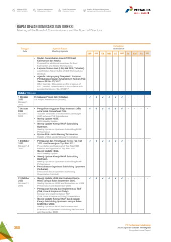 RAPAT DEWAN KOMISARIS DAN DIREKSIMeeting of the Board of Commissioners and the Board of DirectorsLaporan ManajemenManagement ReportProfil PerusahaanCompany ProfileAnalisa & Diskusi ManajemenManagement Discussion & AnalysisIkhtisar 20202020 HighlightsPT Pertamina Hulu Energi2020 Laporan Tahunan TerintegrasiIntegrated Annual Report 368TanggalDateAgenda RapatMeeting Agenda KehadiranAttendanceBP JHS TA MK LE HMZ M AM AS SRP%u2022 Usulan Penambahan Insentif WK East Kalimantan dan Attaka.Proposal for additional incentives for East Kalimantan and Attaka Working Area.%u2022 Laporan Status Aset (LSA) WK SES (Terbatas).Asset Status Report (LSA) of SES Working Area (limited).%u2022 Agenda Lainnya yang Disepakati : Lanjutan Pembahasan Usulan Amandemen Kontrak PSC Sesuai PP No.27/2017.Other Agenda : Discussion on the proposal of PSC Contract Amendments in Accordance with presidential decree No. 27/2017.Oktober | October1 Oktober 2020October 1, 2020Pemaparan Proyek Gili (Terbatas).Gili Project Presentation (limited).%u221a %u221a %u221a %u221a %u221a %u221a - - - -7 Oktober 2020October 7, 2020%u2022 Pengalihan Anggaran Biaya Investasi (ABI) antar Anak Perusahaan PHE.Transfer oTransfer of Investment Cost Budget (ABI) between PHE Subsidiaries.%u2022 Weekly Update HSSE.HSSE Weekly Update.%u2022 Weekly Update Kinerja RKAP Subholding Upstream.Weekly Update on Upstream Subholding RKAP Performance.%u2022 Update Blok Jambi Merang Termination.Update of Blok Jambi Merang Termination.%u221a %u221a %u221a %u221a %u221a %u221a - - - -14 Oktober 2020October 14, 2020%u2022 Pemaparan dan Persetujuan Revisi Top Risk2020 dan Persetujuan Top Risk 2021.Presentation and Approval of Top Risk 2020 Revision and Approval of Top Risk 2021.%u2022 Weekly Update HSSE.HSSE Weekly Update.%u2022 Weekly Update Kinerja RKAP Subholding Upstream.Weekly Update on Upstream Subholding RKAP Performance.%u2022 Pembahasan Organisasi Subholding Upstream (Terbatas).Discussion about Upstream Subholding Organization (Limited).%u221a %u221a %u221a %u221a %u221a %u221a - - - -21 Oktober 2020October 21, 2020%u2022 Weekly Update HSSE dan Evaluasi Kinerja HSSE sampai Bulan September 2020.Weekly Update on HSSE and Evaluation on HSSE Performance until September 2020.%u2022 Pemaparan Konsep dan Implementasi TGIF (Talk, Grow & Inspire on Friday).Concept and implementation TGIF (Talk, Grow & Inspire on Friday) Presentation.%u2022 Weekly Update Kinerja RKAP dan Evaluasi Kinerja Subholding Upstream sampai Bulan September 2020.Weekly Update on RKAP Performance and Evaluation of Upstream Subholding Performance until September 2020.%u221a %u221a %u221a %u221a %u221a %u221a - - - -
