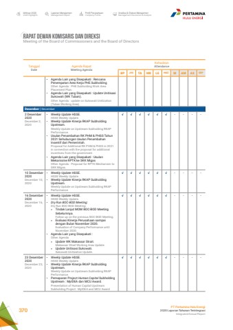 RAPAT DEWAN KOMISARIS DAN DIREKSIMeeting of the Board of Commissioners and the Board of DirectorsLaporan ManajemenManagement ReportProfil PerusahaanCompany ProfileAnalisa & Diskusi ManajemenManagement Discussion & AnalysisIkhtisar 20202020 HighlightsPT Pertamina Hulu Energi2020 Laporan Tahunan TerintegrasiIntegrated Annual Report 370TanggalDateAgenda RapatMeeting Agenda KehadiranAttendanceBP JHS TA MK LE HMZ M AM AS SRP%u2022 Agenda Lain yang Disepakati : Rencana Penempatan Area Kerja PHE SubholdingOther Agenda : PHE Subholding Work Area Placement Plan.%u2022 Agenda Lain yang Disepakati : Update Unitisasi Sukowati (WK Tuban).Other Agenda : update on Sukowati Unitization (Tuban Working Area).Desember | December2 Desember 2020December 2, 2020%u2022 Weekly Update HSSE.HSSE Weekly Update.%u2022 Weekly Update Kinerja RKAP Subholding Upstream.Weekly Update on Upstream Subholding RKAP Performance.%u2022 Usulan Penambahan RK PHM & PHSS Tahun 2021 Sehubungan Usulan Penambahan Insentif dari Pemerintah.Proposal for Additional RK PHM & PHSS in 2021 in connection with the proposal for additional incentives from the government.%u2022 Agenda Lain yang Disepakati : Usulan Mekanisme RPTK ke SKK MigasOther Agenda : Proposal for RPTK Mechanism to SKK Migas.%u221a %u221a %u221a %u221a %u221a %u221a - - - -10 Desember 2020December 10, 2020%u2022 Weekly Update HSSE.HSSE Weekly Update.%u2022 Weekly Update Kinerja RKAP Subholding Upstream.Weekly Update on Upstream Subholding RKAP Performance.%u221a %u221a %u221a %u221a %u221a %u221a - - - -16 Desember 2020December 16, 2020%u2022 Weekly Update HSSE.HSSE Weekly Update.%u2022 Dry Run BOC-BOD Meeting:Dry Run BOC-BOD Meeting:%u00bb Tindak Lanjut MOM BOC-BOD Meeting Sebelumnya.Follow up on the previous BOC-BOD Meeting.%u00bb Evaluasi Kinerja Perusahaan sampai dengan Bulan November 2020.Evaluation of Company Performance until November 2020.%u2022 Agenda Lain yang Disepakati :Other Agenda%u00bb Update WK Makassar Strait.Makassar Strait Working Area Update.%u00bb Update Unitisasi Sukowati.Sukowati Unitization Update.%u221a %u221a %u221a %u221a %u221a %u221a - - - -23 Desember 2020December 23, 2020%u2022 Weekly Update HSSE.HSSE Weekly Update.%u2022 Weekly Update Kinerja RKAP Subholding Upstream.Weekly Update on Upstream Subholding RKAP Performance.%u2022 Pemaparan Project Human Capital Subholding Upstream : MyIDEA dan MCU Award.Presentation of Human Capital Upstream Subholding Project : MyIDEA and MCU Award%u221a %u221a %u221a %u221a %u221a %u221a - - - -