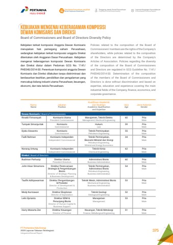 KEBIJAKAN MENGENAI KEBERAGAMAN KOMPOSISI DEWAN KOMISARIS DAN DIREKSIBoard of Commissioners and Board of Directors Diversity PolicyKebijakan terkait komposisi Anggota Dewan Komisaris merupakan hak pemegang saham Perusahaan, sedangkan kebijakan terkait komposisi anggota Direksi ditentukan oleh Anggaran Dasar Perusahaan. Kebijakan mengenai keberagaman komposisi Dewan Komisaris dan Direksi diatur dalam Pedoman GCG No. 1141/PHE040/2014-S0. Penentuan komposisi anggota Dewan Komisaris dan Direksi dilakukan tanpa diskriminasi dan berdasarkan keahlian, pendidikan dan pengalaman yang mencakup bidang industri utama Perusahaan, keuangan, ekonomi, dan tata kelola Perusahaan.Policies related to the composition of the Board of Commissioners%u2019 members are the rights of the Company%u2019s shareholders, while policies related to the composition of the Directors are determined by the Company%u2019s Articles of Association. Policies regarding the diversity of the composition of the Board of Commissioners and Directors are regulated in GCG Guideline No. 1141/PHE040/2014-S0. Determination of the composition of the members of the Board of Commissioners and Directors is done without discrimination and based on expertise, education and experience covering the main industrial fields of the Company, finance, economics, and corporate governance.Nama NameJabatanPositionKualifikasi Akademikdan KeahlianAcademic Qualificationand ExpertiseUsiaAgeJenis KelaminGenderDewan Komisaris | Board of CommissionersRinaldi Firmansyah Komisaris UtamaPresident CommissionerManajemen, Teknik ElektroManagenemt, Electrical Engineering60 PriaMaleTumpak Simanjuntak KomisarisCommissionerHukumLaw59 PriaMaleDjoko Siswanto KomisarisCommissionerTeknik PerminyakanPetroleum Engineering55 PriaMaleFadli Rahman Komisaris IndependenIndependent CommissionerTeknik Perminyakan, Ekonomi Mineral dan EnergiPetroleum Engineering, Mineral and Energy Economics34 PriaMaleNanang Untung Komisaris IndependenIndependent CommissionerTeknik KimiaChemical Engineering, 62 PriaMaleDireksi | Board of DirectorsBudiman Parhusip Direktur UtamaPresident DirectorsAdministrasi BisnisBusiness Administration60 PriaMaleJohn Hisar Simamora Direktur Perencanaan Strategis & Pengembangan BisnisDirector of Strategic Planning & Business DevelopmentTeknik Perminyakan, Administrasi BisnisPetroleum Engineering,Business Administration54 PriaMaleTaufik Aditiyawarman Direktur Pengembangan & ProduksiDirector of Development & ProductionTeknik Mesin, Administrasi BisnisMechanical Engineering, Business Administration53 PriaMaleMedy Kurniawan Direktur EksplorasiDirector of ExplorationTeknik GeologiGeological Engineering52 PriaMaleLelin Eprianto Direktur SDM & Penunjang BisnisDirector of Human Capital & Business SupportManajemenManagement53 PriaMaleHarry Mozarta Zen Direktur KeuanganDirector of FinanceKeuangan, Teknik MetalurgiFinance, Metallurgical Engineering51 PriaMaleTata Kelola Perusahaan yang BaikGood Corporate GovernanceTanggung Jawab Sosial PerusahaanCorporate Social ResponsibilityLaporan Keuangan KonsolidasianConsolidated Financial ReportPT Pertamina Hulu Energi2020 Laporan Tahunan TerintegrasiIntegrated Annual Report 375