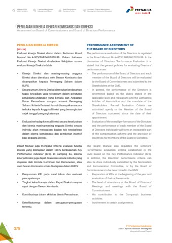 PENILAIAN KINERJA DEWAN KOMISARIS DAN DIREKSIAssesment on Board of Commissioners and Board of Directors PerformancePENILAIAN KINERJA DIREKSI [102-28] Evaluasi kinerja Direksi diatur dalam Pedoman Board Manual No.A-005/PHE040/2018-S9. Dalam bahasan Evaluasi Kinerja Direksi disebutkan Kebijakan umum evaluasi kinerja Direksi adalah: %u2022 Kinerja Direksi dan masing-masing anggota Direksi akan dievaluasi oleh Dewan Komisaris dan disampaikan kepada Pemegang Saham dalam RUPS. %u2022 Secara umum, kinerja Direksi ditentukan berdasarkan tugas kewajiban yang tercantum dalam peraturan perundang-undangan yang berlaku dan Anggaran Dasar Perusahaan maupun amanat Pemegang Saham. Kriteria Evaluasi formal disampaikan secara terbuka kepada Anggota Direksi yang bersangkutan sejak tanggal pengangkatannya. %u2022 Evaluasi terhadap kinerja Direksi secara keseluruhan dan kinerja masing-masing anggota Direksi secara individu akan merupakan bagian tak terpisahkan dalam skema kompensasi dan pemberian insentif bagi anggota Direksi. Board Manual juga mengatur Kriteria Evaluasi Kinerja Direksi yang ditetapkan dalam RUPS berdasarkan Key Performance Indicator (KPI). Di samping itu, kriteria kinerja Direksi juga dapat dilakukan secara individu yang diajukan oleh Komite Nominasi dan Remunerasi, atau oleh Dewan Komisaris untuk ditetapkan dalam RUPS:%u2022 Penyusunan KPI pada awal tahun dan evaluasi pencapaiannya. %u2022 Tingkat kehadirannya dalam Rapat Direksi maupun rapat dengan Dewan Komisaris. %u2022 Kontribusinya dalam aktivitas bisnis Perusahaan. %u2022 Keterlibatannya dalam penugasan-penugasan tertentu. PERFORMANCE ASSESSMENT OF THE BOARD OF DIRECTORS The performance evaluation of the Directors is regulated in the Board Manual No.A-005/ PHE040/2018-S9. In the discussion of Directors %u2018Performance Evaluation it is stated that the general policies for evaluating Directors%u2019 performance are: %u2022 The performance of the Board of Directors and each member of the Board of Directors will be evaluated by the Board of Commissioners and submitted to the Shareholders at the GMS. %u2022 In general, the performance of the Directors is determined based on the duties stated in the applicable laws and regulations and the Company%u2019s Articles of Association and the mandate of the Shareholders. Formal Evaluation Criteria are submitted openly to the Member of the Board of Directors concerned since the date of their appointment. %u2022 Evaluation of the overall performance of the Directors and the performance of each member of the Board of Directors individually will form an inseparable part of the compensation scheme and the provision of incentives for members of the Board of Directors. The Board Manual also regulates the Directors%u2019 Performance Evaluation Criteria established in the GMS based on the Key Performance Indicator (KPI). In addition, the Directors%u2019 performance criteria can also be done individually submitted by the Nomination and Remuneration Committee, or by the Board of Commissioners to be determined in the GMS:%u2022 Preparation of KPIs at the beginning of the year and evaluation of their achievements. %u2022 The level of attendance at the Board of Directors%u2019 Meetings and meetings with the Board of Commissioners. %u2022 His contribution to the Company%u2019s business activities. %u2022 Involvement in certain assignments. Laporan ManajemenManagement ReportProfil PerusahaanCompany ProfileAnalisa & Diskusi ManajemenManagement Discussion & AnalysisIkhtisar 20202020 HighlightsPT Pertamina Hulu Energi2020 Laporan Tahunan TerintegrasiIntegrated Annual Report 378