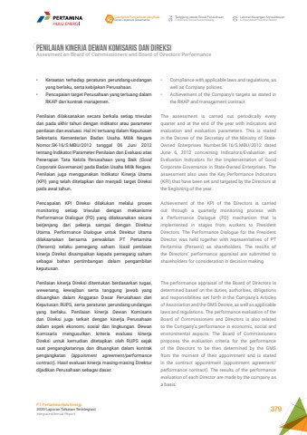 PENILAIAN KINERJA DEWAN KOMISARIS DAN DIREKSIAssesment on Board of Commissioners and Board of Directors Performance%u2022 Ketaatan terhadap peraturan perundang-undangan yang berlaku, serta kebijakan Perusahaan. %u2022 Pencapaian target Perusahaan yang tertuang dalam RKAP dan kontrak manajemen. Penilaian dilaksanakan secara berkala setiap triwulan dan pada akhir tahun dengan indikator atau parameter penilaian dan evaluasi. Hal ini tertuang dalam Keputusan Sekretaris Kementerian Badan Usaha Milik Negara Nomor.SK-16/S.MBU/2012 tanggal 06 Juni 2012 tentang Indikator/Parameter Penilaian dan Evaluasi atas Penerapan Tata Kelola Perusahaan yang Baik (Good Corporate Governance) pada Badan Usaha Milik Negara. Penilaian juga menggunakan Indikator Kinerja Utama (KPI) yang telah ditetapkan dan menjadi target Direksi pada awal tahun. Pencapaian KPI Direksi dilakukan melalui proses monitoring setiap triwulan dengan mekanisme Performance Dialogue (PD) yang dilaksanakan secara berjenjang dari pekerja sampai dengan Direktur Utama. Performance Dialogue untuk Direktur Utama dilaksanakan bersama perwakilan PT Pertamina (Persero) selaku pemegang saham. Hasil penilaian kinerja Direksi disampaikan kepada pemegang saham sebagai bahan pertimbangan dalam pengambilan keputusan. Penilaian kinerja Direksi ditentukan berdasarkan tugas, wewenang, kewajiban serta tanggung jawab yang dituangkan dalam Anggaran Dasar Perusahaan dan Keputusan RUPS, serta peraturan perundang-undangan yang berlaku. Penilaian kinerja Dewan Komisaris dan Direksi juga terkait dengan kinerja Perusahaan dalam aspek ekonomi, sosial dan lingkungan. Dewan Komisaris mengusulkan kriteria evaluasi kinerja Direksi untuk kemudian ditetapkan oleh RUPS sejak saat pengangkatannya dan dituangkan dalam kontrak pengangkatan (appoinment agreement/performance contract). Hasil evaluasi kinerja masing-masing Direktur dijadikan Perusahaan sebagai dasar:%u2022 Compliance with applicable laws and regulations, as well as Company policies. %u2022 Achievement of the Company%u2019s targets as stated in the RKAP and management contract.The assessment is carried out periodically every quarter and at the end of the year with indicators and evaluation and evaluation parameters. This is stated in the Decree of the Secretary of the Ministry of StateOwned Enterprises Number.SK-16/S.MBU/2012 dated June 6, 2012 concerning Indicators/Evaluation and Evaluation Indicators for the Implementation of Good Corporate Governance in State-Owned Enterprises. The assessment also uses the Key Performance Indicators (KPI) that have been set and targeted by the Directors at the beginning of the year. Achievement of the KPI of the Directors is carried out through a quarterly monitoring process with a Performance Dialogue (PD) mechanism that is implemented in stages from workers to President Directors. The Performance Dialogue for the President Director was held together with representatives of PT Pertamina (Persero) as shareholders. The results of the Directors%u2019 performance appraisal are submitted to shareholders for consideration in decision making. The performance appraisal of the Board of Directors is determined based on the duties, authorities, obligations and responsibilities set forth in the Company%u2019s Articles of Association and the GMS Decree, as well as applicable laws and regulations. The performance evaluation of the Board of Commissioners and Directors is also related to the Company%u2019s performance in economic, social and environmental aspects. The Board of Commissioners proposes the evaluation criteria for the performance of the Directors to be then determined by the GMS from the moment of their appointment and is stated in the contract appointment (appoinment agreement/performance contract). The results of the performance evaluation of each Director are made by the company as a basis: Tata Kelola Perusahaan yang BaikGood Corporate GovernanceTanggung Jawab Sosial PerusahaanCorporate Social ResponsibilityLaporan Keuangan KonsolidasianConsolidated Financial ReportPT Pertamina Hulu Energi2020 Laporan Tahunan TerintegrasiIntegrated Annual Report 379