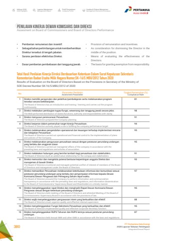PENILAIAN KINERJA DEWAN KOMISARIS DAN DIREKSIAssesment on Board of Commissioners and Board of Directors Performance%u2022 Pemberian remunerasi dan insentif. %u2022 Sebagai bahan pertimbangan untuk memberhentikan Direktur tersebut di tengah jabatan. %u2022 Sarana penilaian efektivitas Direksi. %u2022 Dasar pemberian pembebasan dari tanggung jawab.%u2022 Provision of remuneration and incentives. %u2022 As consideration for dismissing the Director in the middle of the position. %u2022 Means of evaluating the effectiveness of the Directors. %u2022 The basis for granting exemption from responsibility.No Parameter PenilaianAssesment ParameterTingkat Pemenuhan (%)Compliance Rate1 Direksi memiliki pengenalan dan pelatihan/pembelajaran serta melaksanakan program tersebut secara berkelanjutan.The Board of Directors has an introduction and training / learning and carries out the program continuously.812 Direksi melakukan pembagian tugas/fungsi, wewenang dan tanggung jawab secara jelas.The BOD performed distribution of duties/functions, authority and responsibilities with clarity.983 Direksi menyusun perencanaan Perusahaan.The Board of Directors prepared the Company planning.914 Direksi berperan dalam pemenuhan target kinerja Perusahaan.The Board of Directors actively played a role in fulfilling the company performance target.945 Direksi melaksanakan pengendalian operasional dan keuangan terhadap implementasi rencana dan kebijakan Perusahaan.The Board of Directors carried out operational and financial control to the implementation of plans and policies of the Company.956 Direksi melaksanakan pengurusan perusahaan sesuai dengan peraturan perundang-undangan yang berlaku dan anggaran dasar.The Board of Directors carried out managerial affairs of the company in accordance with the prevailing laws and regulations and articles of association.957 Direksi melakukan hubungan yang bernilai tambah bagi perusahaan dan stakeholders.The Board of Directors built an added-value relationship for the compay and stakeholders.918 Direksi memonitor dan mengelola potensi benturan kepentingan anggota Direksi dan manajemen di bawah Direksi.The Board of Directors monitored and managed potential conflict of interest of members of the Board of Directors and management under the Board of Directors.939 Direksi memastikan Perusahaan melaksanakan keterbukaan informasi dan komunikasi sesuai peraturan perundang-undangan yang berlaku dan penyampaian informasi kepada Dewan Komisaris/Dewan Pengawas dan Pemegang Saham tepat waktu.The Board of Directors ensured the Company to perform information and communciation transparency in accordance with the prevailing laws and regulations, and information dissemination to the Board of Commissioners/ Supervisory Board and Shareholders in a timely manner.9710 Direksi menyelenggarakan rapat Direksi dan menghadiri Rapat Dewan Komisaris/Dewan Pengawas sesuai dengan ketentuan perundang-undangan.The Board of Directors held meeting of the Board of Directors and attended Meeting of the Board of Commissioners/ Supervisory Board in accordance with the provisions of law.9511 Direksi wajib menyelenggarakan pengawasan intern yang berkualitas dan efektif.The Board of Directors must organize quality and effective internal supervision.8812 Direksi menyelenggarakan Fungsi Sekretaris Perusahaan yang berkualitas dan efektif.The Board of Directors implemented quality and effective Corporate Secretary function.9513 Direksi menyelenggarakan RUPS Tahunan dan RUPS lainnya sesuai peraturan perundangundangan.The Board of Directors held Annual GMS and other GMS in accordance with the laws and regulations.87Total Hasil Penilaian Kinerja Direksi Berdasarkan Ketentuan Dalam Surat Keputusan Sekretaris Kementerian Badan Usaha Milik Negara Nomor.SK-16/S.MBU/2012 Tahun 2020Results of Evaluation on the Board of Directors Based on the Provisions in Secretary of the Ministry of SOE Decree Number SK-16/S.MBU/2012 of 2020Laporan ManajemenManagement ReportProfil PerusahaanCompany ProfileAnalisa & Diskusi ManajemenManagement Discussion & AnalysisIkhtisar 20202020 HighlightsPT Pertamina Hulu Energi2020 Laporan Tahunan TerintegrasiIntegrated Annual Report 380