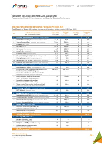 PENILAIAN KINERJA DEWAN KOMISARIS DAN DIREKSIAssesment on Board of Commissioners and Board of Directors PerformanceNo Indikator Kinerja UtamaKey Performance IndicatorTarget 20202020 TargetRealisasi TW-IVQ4 RealizationBobot (%)WeightPencapaian (%)AchievementA Economic and Social Value | Economic and Social Value 65,351 Volume Produksi Minyak | Volume of Oil Production 81,74 81,01 9 8,922 Volume Produksi Gas | Volume of Gas Production 755,84 769,20 9 9,163 R/P Ratio | R/P Ratio 7,34 7,55 7 7,204 EBITDA | EBITDA 678,49 918,34 6 6,605 Net Income | Net Income 64,67 222,95 6 6,606 Gross Profit | Gross Profit 520,73 569,58 5 5,477 Economic Profit | Economic Profit 16,50 19,17 5 5,508 Production Cost per unit | Production Cost per unit 11,43 10,78 5 5,299 Finding Cost per unit | Finding Cost per unit 5,18 2,44 4 4,4010 Development Cost per unit | Development Cost per unit 9,68 9,15 4 4,2211 Follow-up BOC Instruction | Follow-up BOC Instruction 100 100,0 2 2,00B Business Model Innovation | Business Model Innovation 15,911 HSSE Excellence (TRIR) | HSSE Excellence (TRIR) 0,86 0,29 5 5,502 Kontribusi terhadap Penyelesaian Roadmap untuk Pembentukan Legal Subholding Hulu Contribution to the Roadmap Completion for the Establishment of Legal Upstream Subholding Des 2020 Des 2020 2 2,053 HSSE PROPER & SUPREME AssessmentHSSE PROPER & SUPREME Assessment100 104,40 4 4,184 Pengelolaan Kegiatan KSI dan QMA Management of KSI and QMA Activity100 109,0 2 2,185 Tindak Lanjut Rekomendasi Hasil Internal Audit Follow-up of Internal Audit Result Recomendation100 100,0 2 2,00C Technology Leadership | Technology Leadership 6,601 EOR/IOR Uplift | EOR/IOR Uplift 0,23 0,32 6 6,60D Energize Investment | Energize Investment 14.101 Realisasi Investasi (ABI) | Investment Realization (ABI) 85-100 91,12 5 5,502 Average Utilization of TKDN | Average Utilization of TKDN 25 57,48 3 3,303 Realisasi Investasi (Fisik) | Realisasi Investasi (Fisik) 90 118,63 3 3,304 Program Strategic Initiatives | Program Strategic Initiatives 100 100,0 2 2,00E Unleash Talent | Unleash Talent1 Employee Productivity (EBITDA/FTE) Employee Productivity (EBITDA/FTE)180 181,59 2 2,022 Learning Hours (consolidated)Learning Hours (consolidated)2.000 2.515 2 2,20Total Performance | Total Performance 106,18F Boundary KPI | KPI Boundary1 Number of Accident (NoA)*Number of Accident (NoA)*0 4 - -42 Pelaporan e-LHKPN | e-LHKPN Reporting 100 100 - 03 Risk Management ImplementationRealisasi Investasi (Fisik)100 100 - 0Final Performance | Final Performance 102,18Total Hasil Penilaian Direksi Berdasarkan Pencapaian KPI Tahun 2020Total Results of Board of Directors%u2019 Assessment Based on Achievement of KPI Year 2020Tata Kelola Perusahaan yang BaikGood Corporate GovernanceTanggung Jawab Sosial PerusahaanCorporate Social ResponsibilityLaporan Keuangan KonsolidasianConsolidated Financial ReportPT Pertamina Hulu Energi2020 Laporan Tahunan TerintegrasiIntegrated Annual Report 381