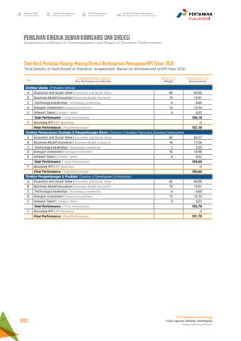PENILAIAN KINERJA DEWAN KOMISARIS DAN DIREKSIAssesment on Board of Commissioners and Board of Directors PerformanceNo Indikator Kinerja UtamaKey Performance IndicatorBobot (%)WeightPencapaian (%)AchievementDirektur Utama | President DirectorA Economic and Social Value | Economic and Social Value 62 65,35B Business Model Innovation | Business Model Innovation 15 15,91C Technology Leadership | Technology Leadership 6 6,60D Energize Investment | Energize Investment 13 14,10E Unleash Talent | Unleash Talent 4 4,22Total Performance | Total Performance 106,18F Boundary KPI | KPI Boundary -4Final Performance | Final Performance 102,18Direktur Perencanaan Strategis & Pengembangan Bisnis | Director of Strategic Planning & Business DevelopmentA Economic and Social Value | Economic and Social Value 62 64,17B Business Model Innovation | Business Model Innovation 16 17,06C Technology Leadership | Technology Leadership 2 2,20D Energize Investment | Energize Investment 16 16,95E Unleash Talent | Unleash Talent 4 4,22Total Performance | Total Performance 104,60F Boundary KPI | KPI Boundary -4Final Performance | Final Performance 100,60Direktur Pengembangan & Produksi | Director of Development & ProductionA Economic and Social Value | Economic and Social Value 62 64,95B Business Model Innovation | Business Model Innovation 15 15,91C Technology Leadership | Technology Leadership 6 6,60D Energize Investment | Energize Investment 13 14,10E Unleash Talent | Unleash Talent 4 4,22Total Performance | Total Performance 105,78F Boundary KPI | KPI Boundary -4Final Performance | Final Performance 101,78Total Hasil Penilaian Masing-Masing Direksi Berdasarkan Pencapaian KPI Tahun 2020Total Results of Each Board of Directors%u2019 Assessment Based on Achievement of KPI Year 2020Laporan ManajemenManagement ReportProfil PerusahaanCompany ProfileAnalisa & Diskusi ManajemenManagement Discussion & AnalysisIkhtisar 20202020 HighlightsPT Pertamina Hulu Energi2020 Laporan Tahunan TerintegrasiIntegrated Annual Report 382